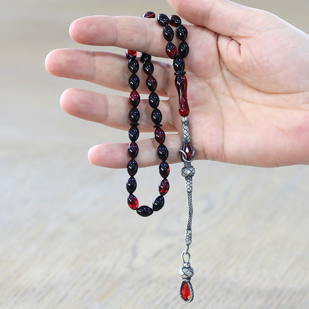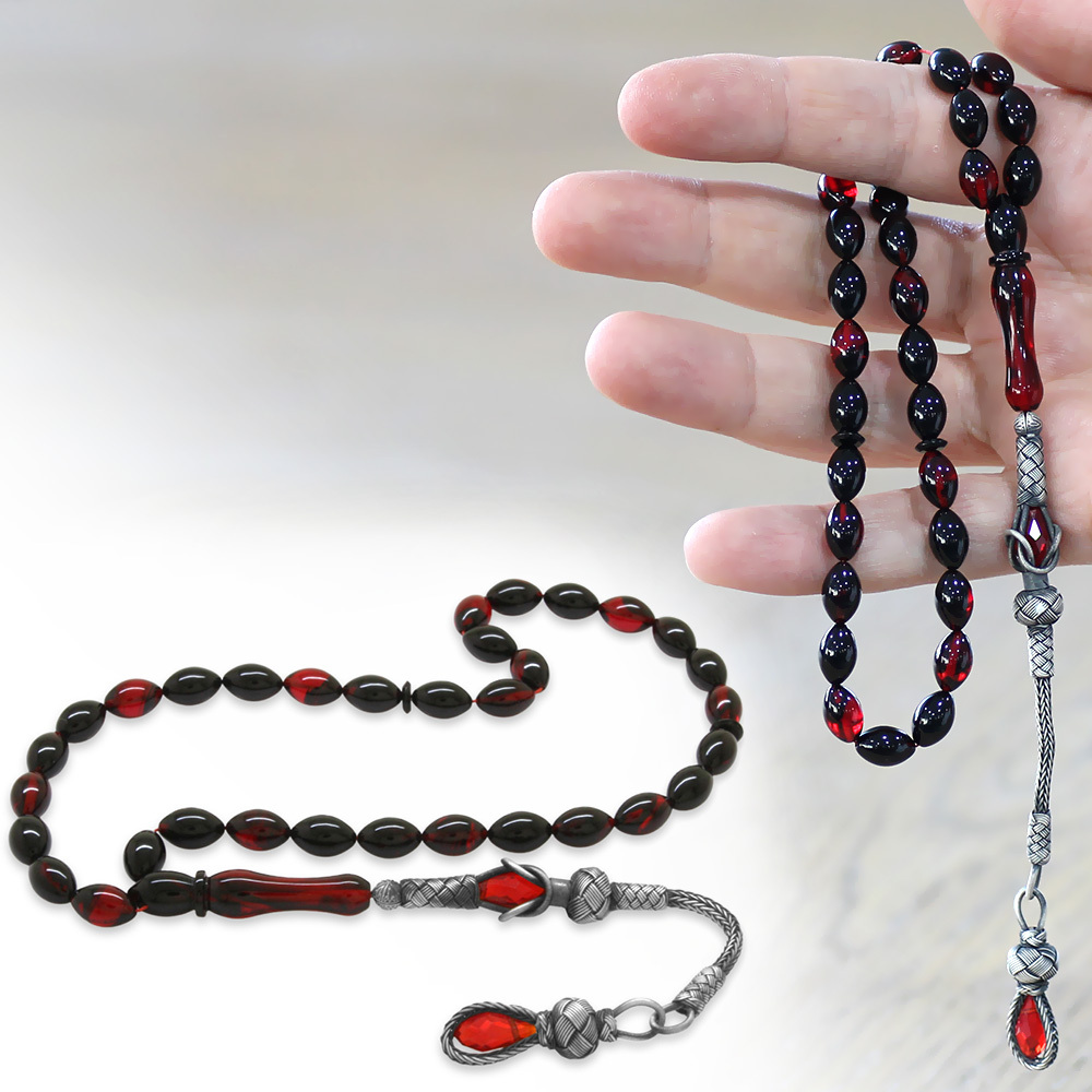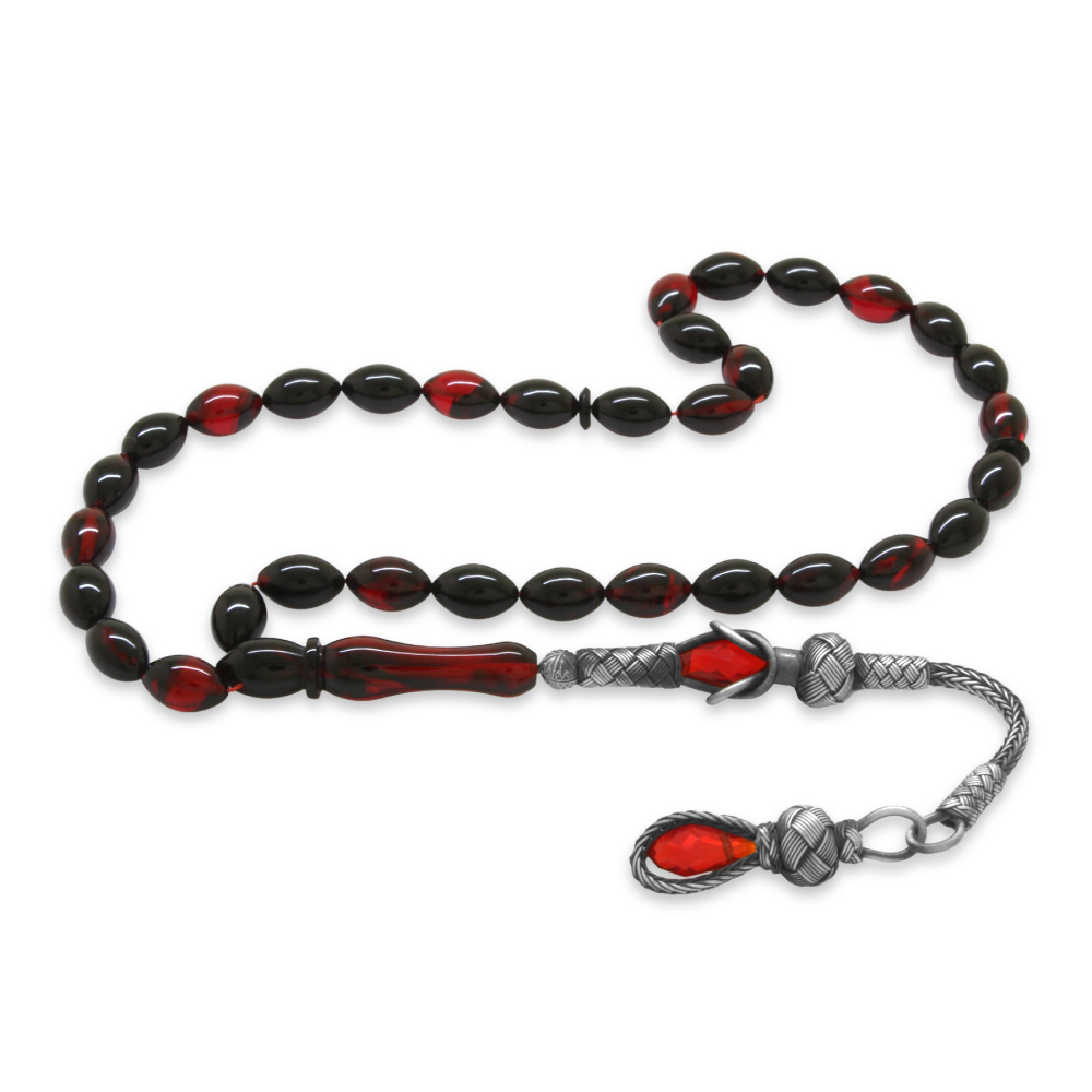 1000 Ayar Gümüş Kazaz Püsküllü Arpa Kesim Kırmızı Siyah Ateş Kehribar Tesbih
