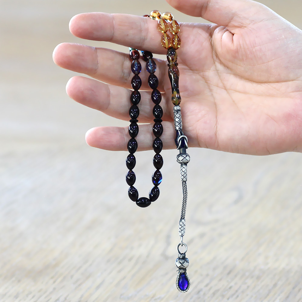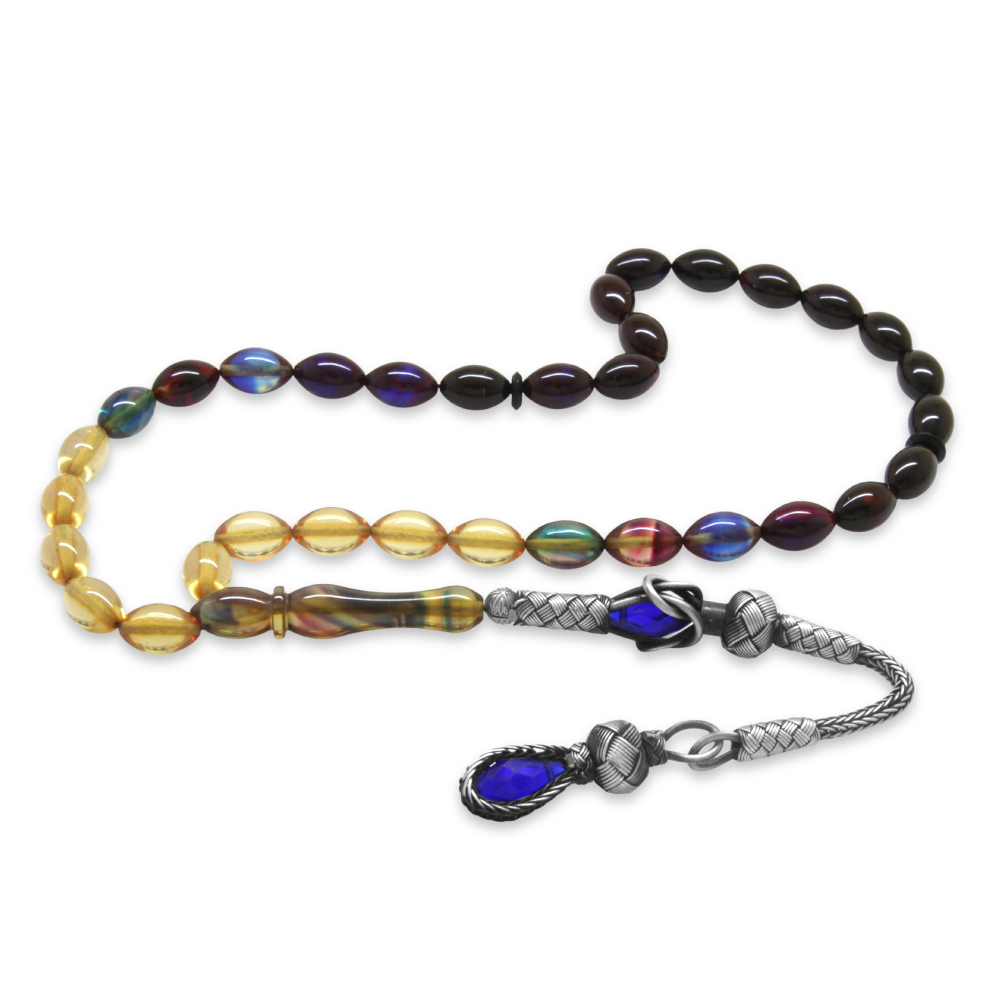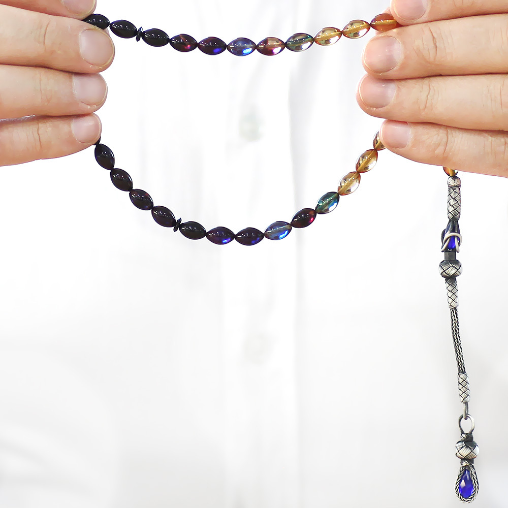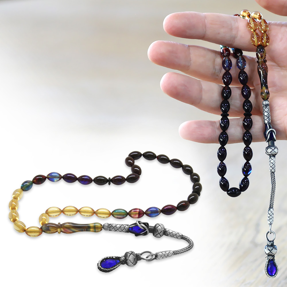 1000 Ayar Gümüş Kazaz Püsküllü Arpa Kesim Süzme Bonibon Ateş Kehribar Tesbih