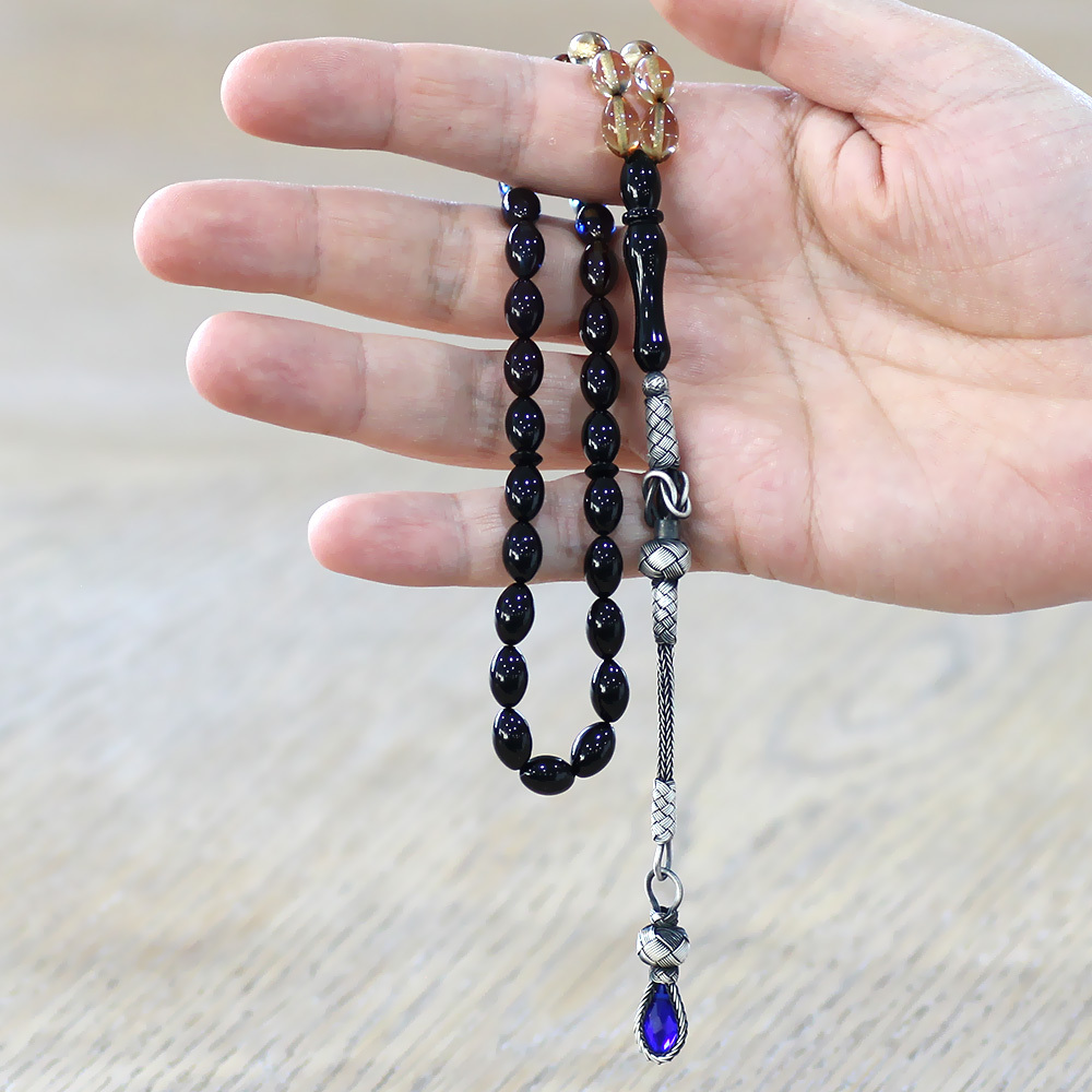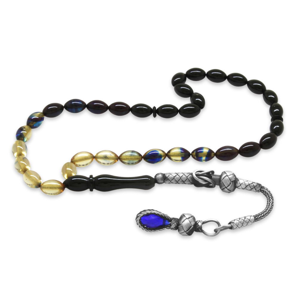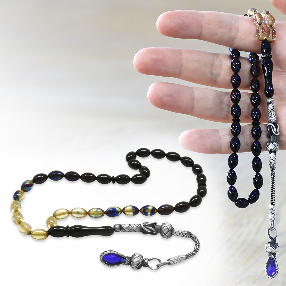 1000 Ayar Gümüş Kazaz Püsküllü Arpa Kesim Süzme Mavi Beyaz Ateş Kehribar Tesbih