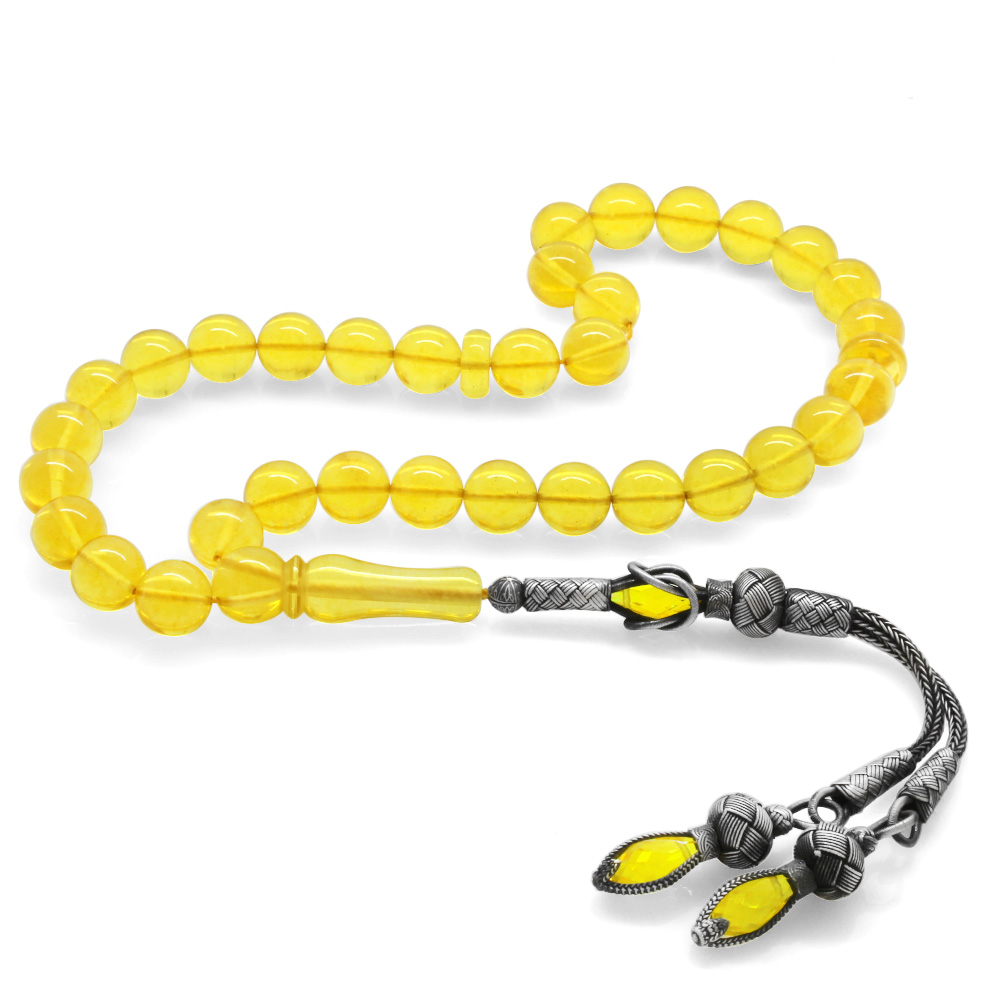 1000 Ayar Gümüş Kazaz Püsküllü Küre Kesim Şeffaf Sarı Damla Kehribar Tesbih - 1