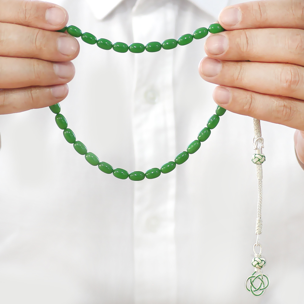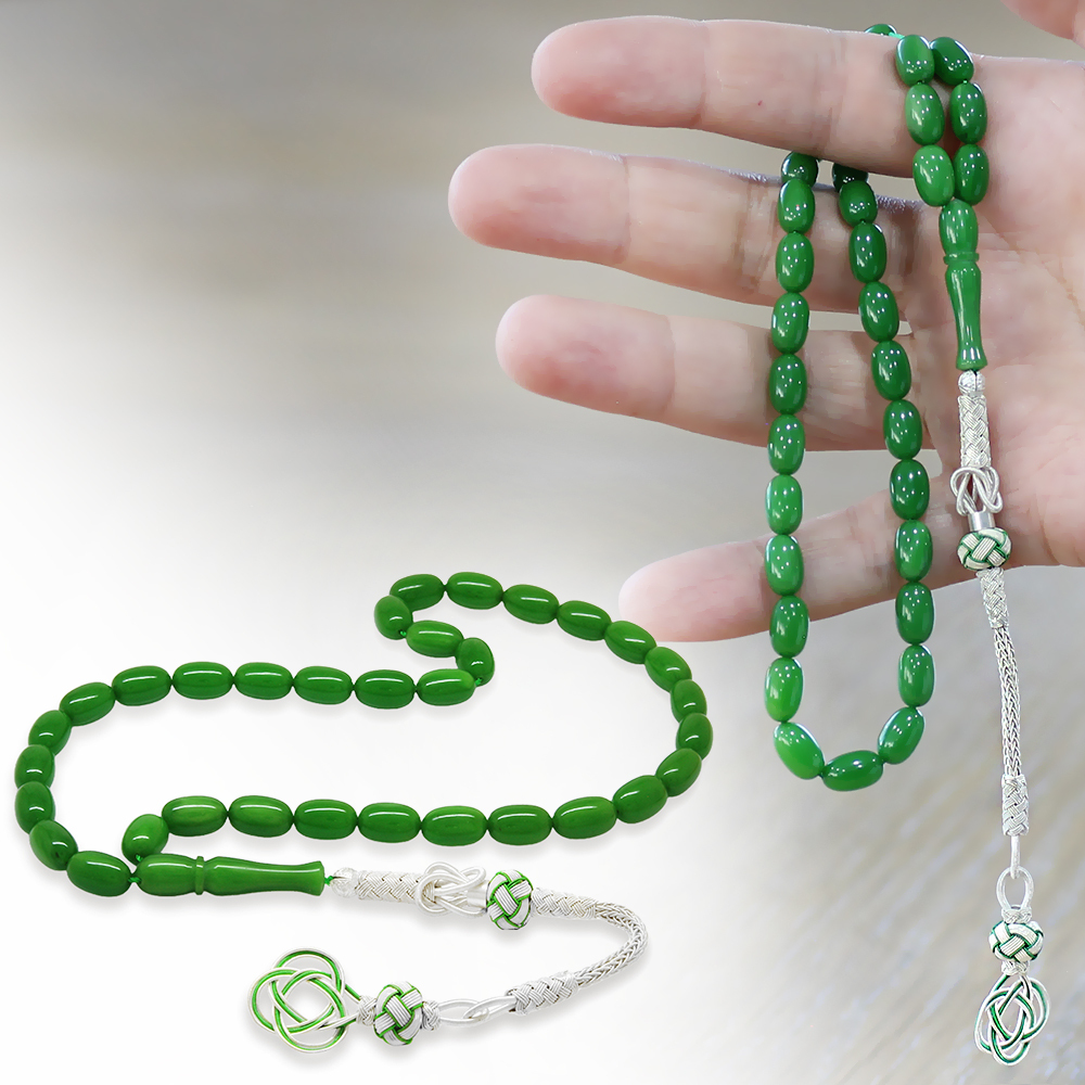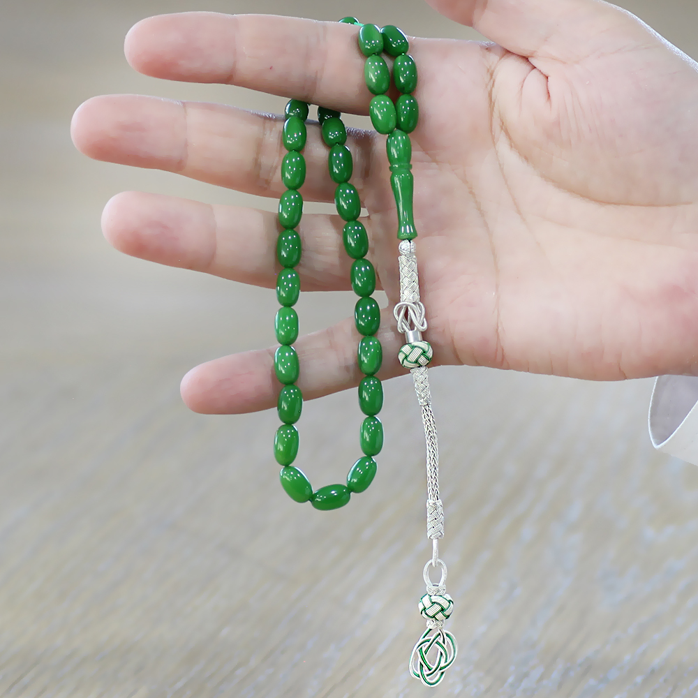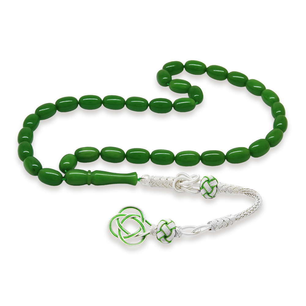 1000 Ayar Gümüş Kazaz Püsküllü Özel Kesim Zümrüt Yeşili Sıkma Kehribar Tesbih