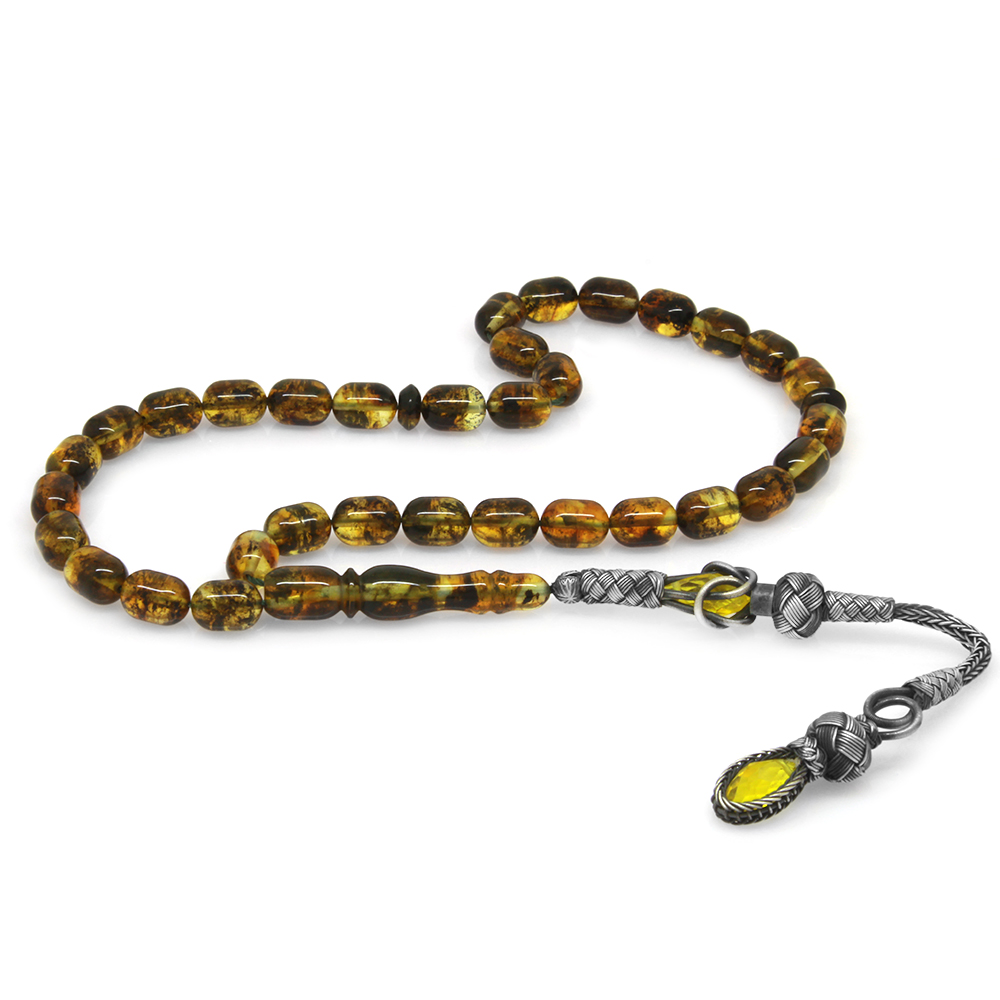 1000 Ayar Gümüş Kazaz Püsküllü Kapsül Kesim Bitki Fosilli Sarı Damla Kehribar Tesbih - 1
