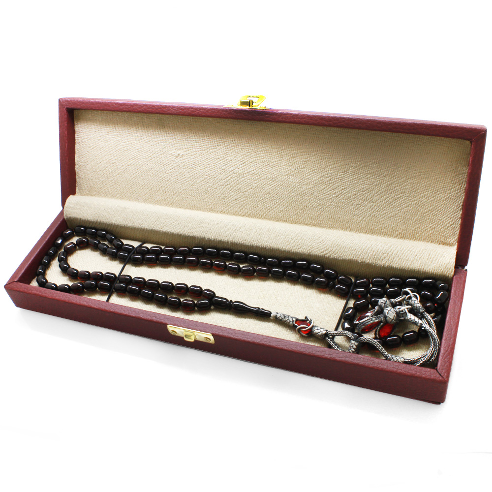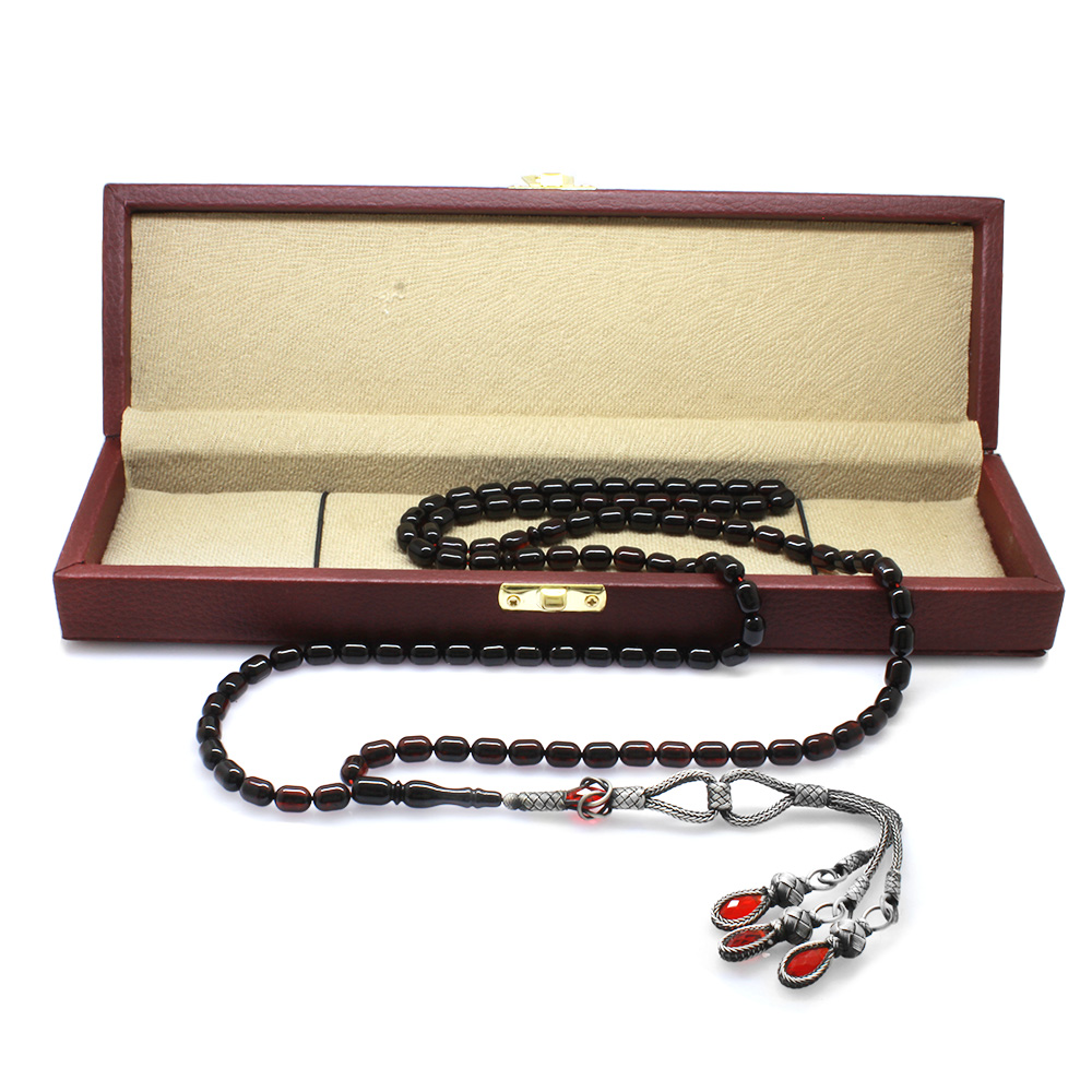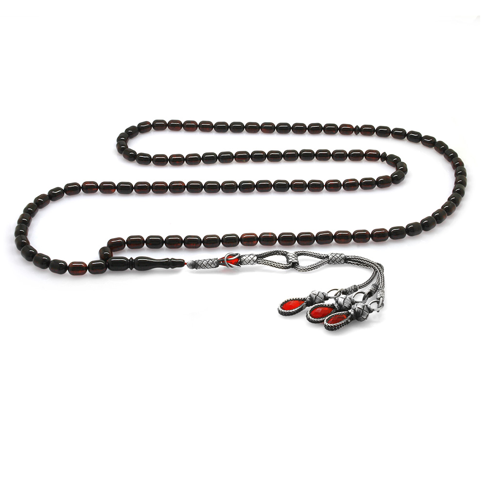 1000 Ayar Gümüş Kazaz Püsküllü Kapsül Kesim Koyu Kırmızı Renk Doğal Damla Kehribar Namaz Tesbihi - 1