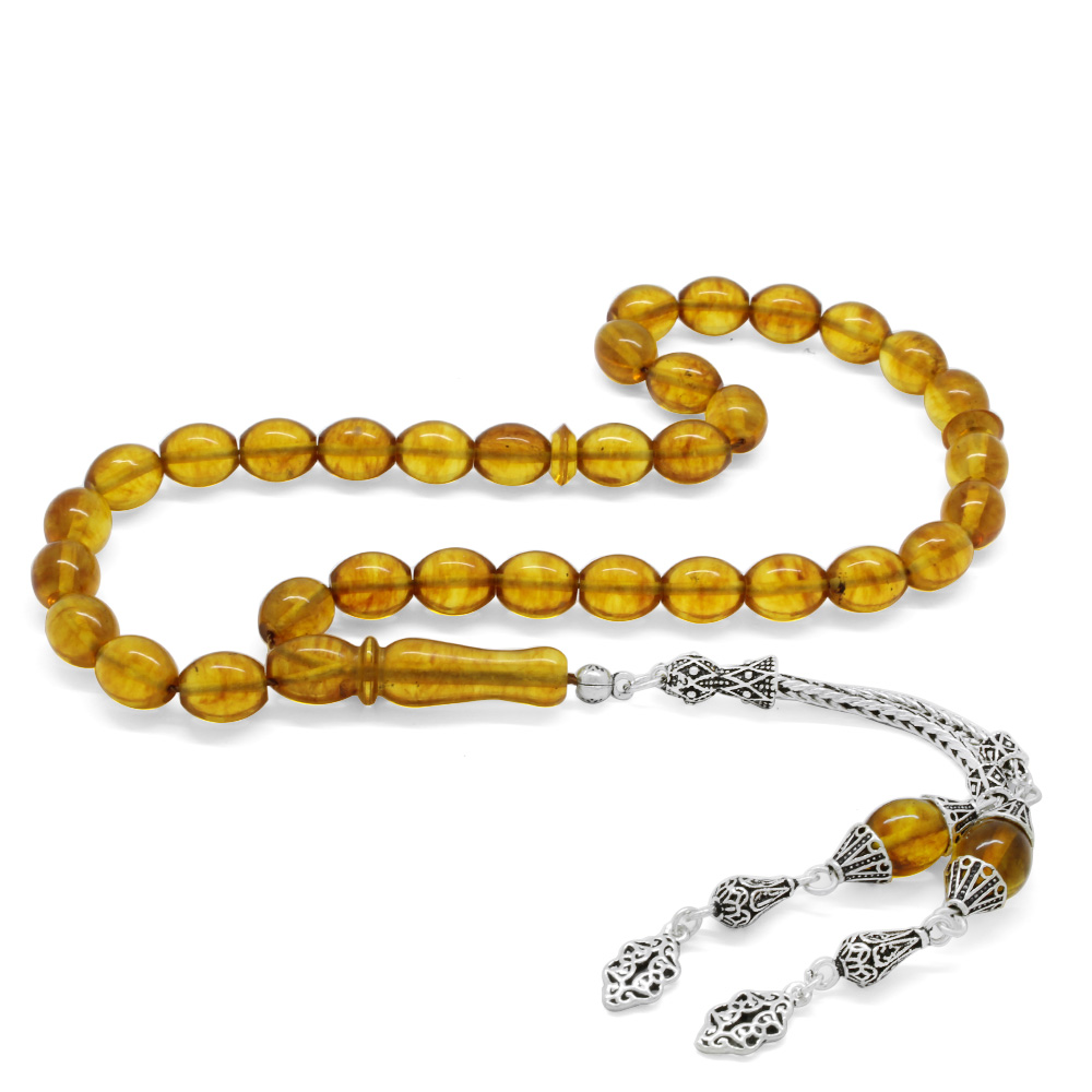 925 Ayar Gümüş Çift Püsküllü Arpa Kesim Açık Sarı Damla Kehribar Tesbih - 1