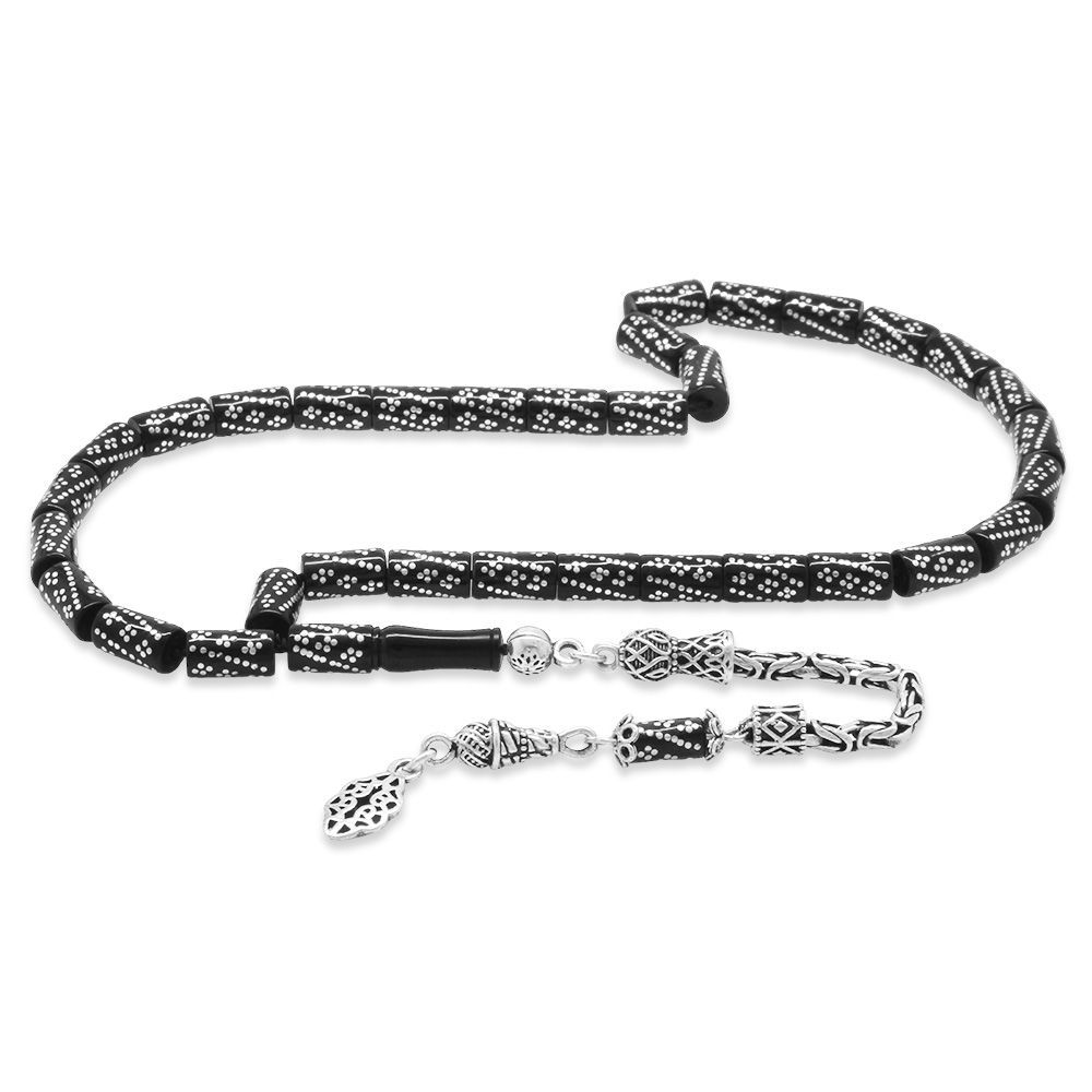 2920 Adet Gümüş Çakım İşlemeli 925 Ayar Gümüş Kral Püsküllü Kesme Kesim Erzurum Oltu Taşı Tesbih