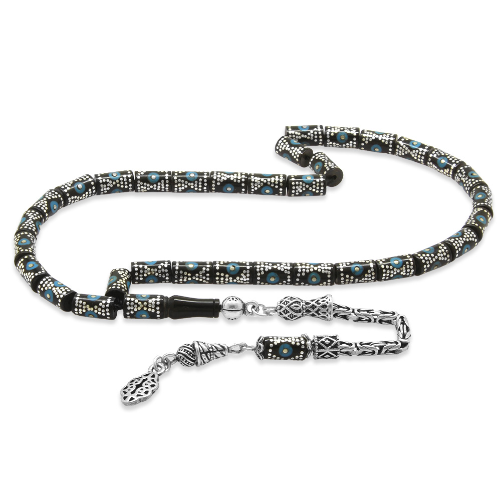 3150 Adet Gümüş Çakım 925 Ayar Gümüş Kral Püsküllü Kesme Kesim Mavi Mineli Erzurum Oltu Taşı Tesbih - 3
