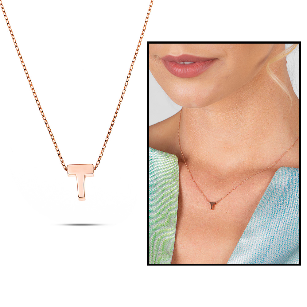 3D Tasarım Rose Renk 925 Ayar Gümüş T Harf Kolye - 3