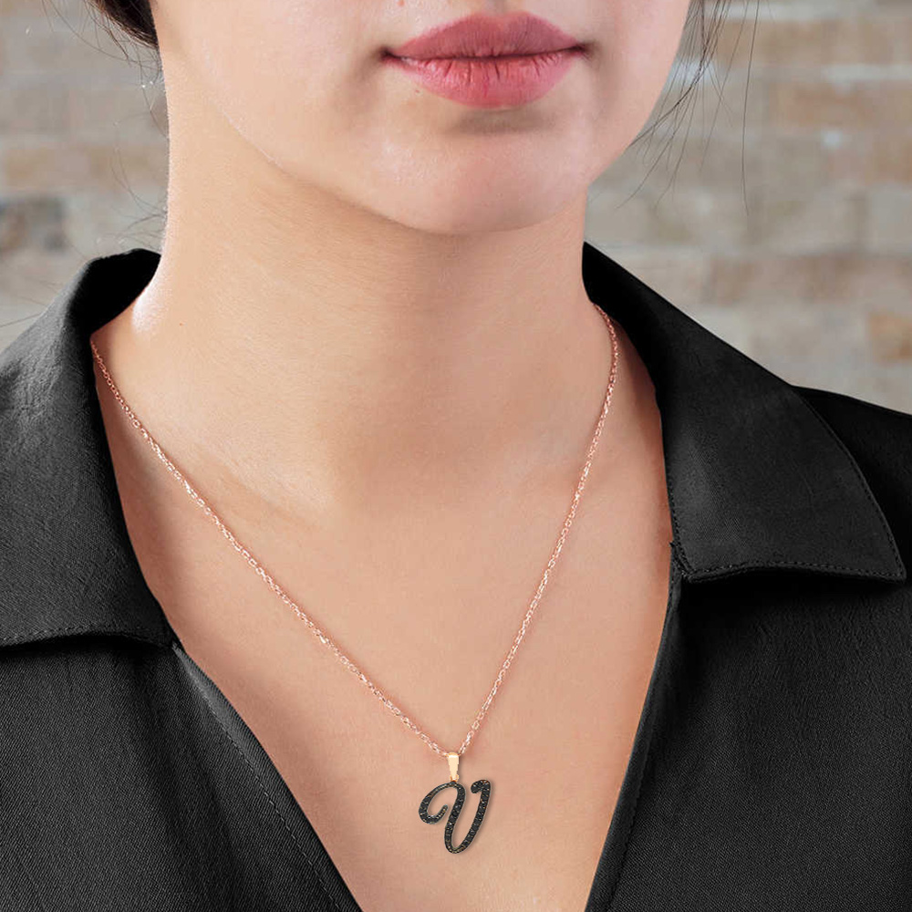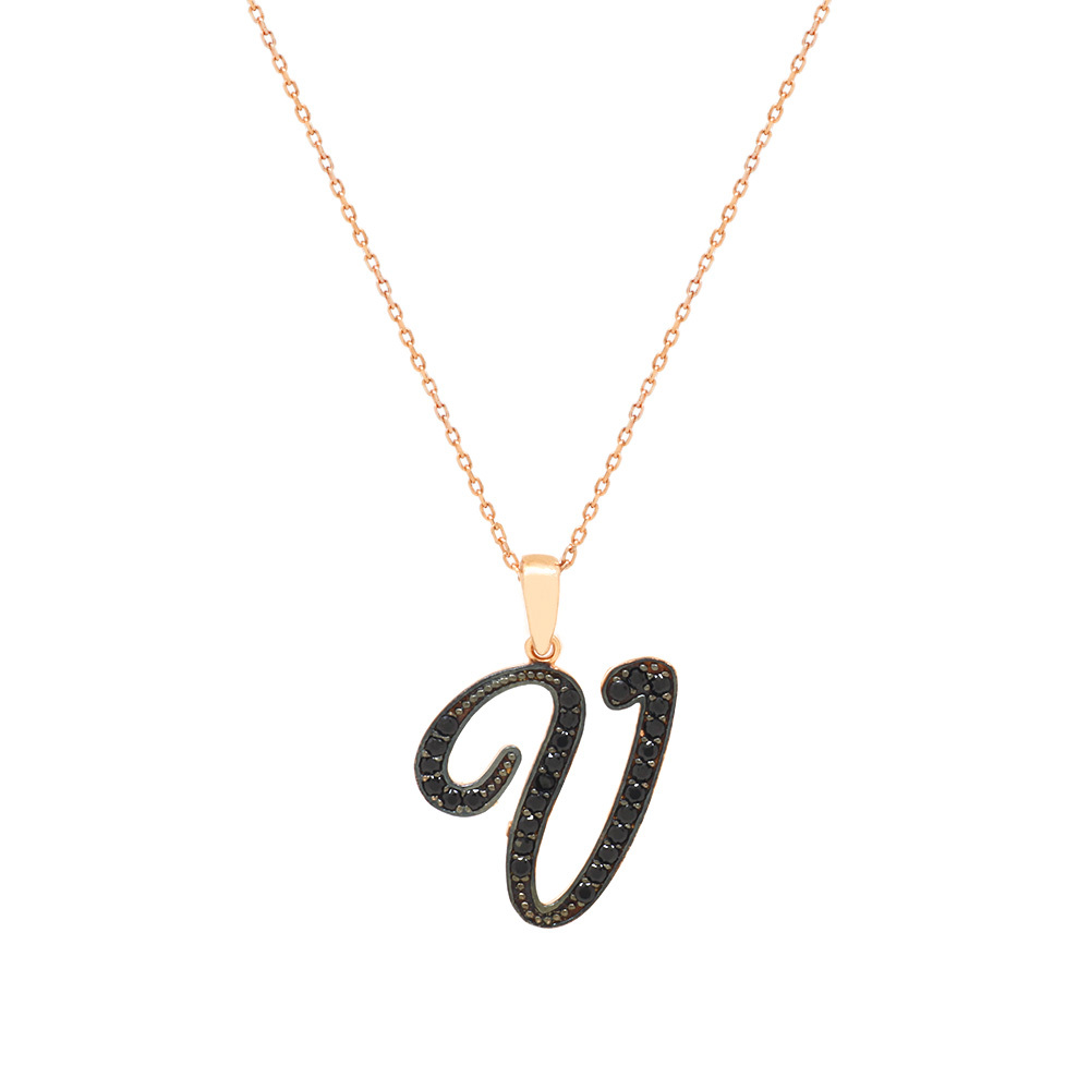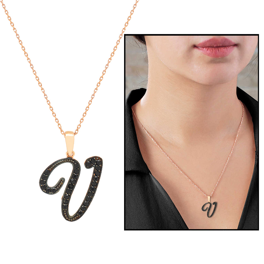 3D Tasarım Siyah Zirkon Taşlı 925 Ayar Gümüş El Yazısı Harf Kolye V