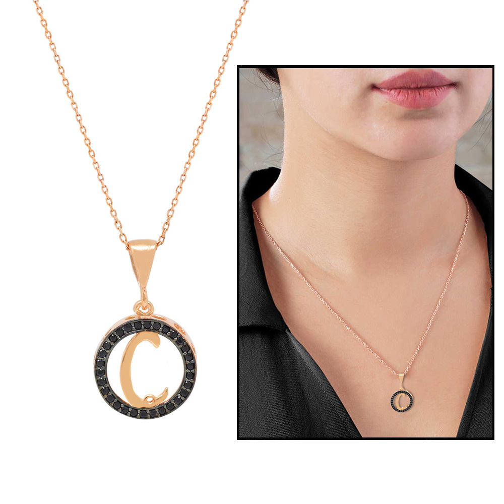 3D Tasarım Siyah Zirkon Taşlı 925 Ayar Gümüş Harf Kolye Ç