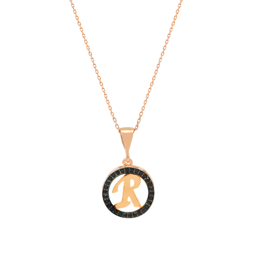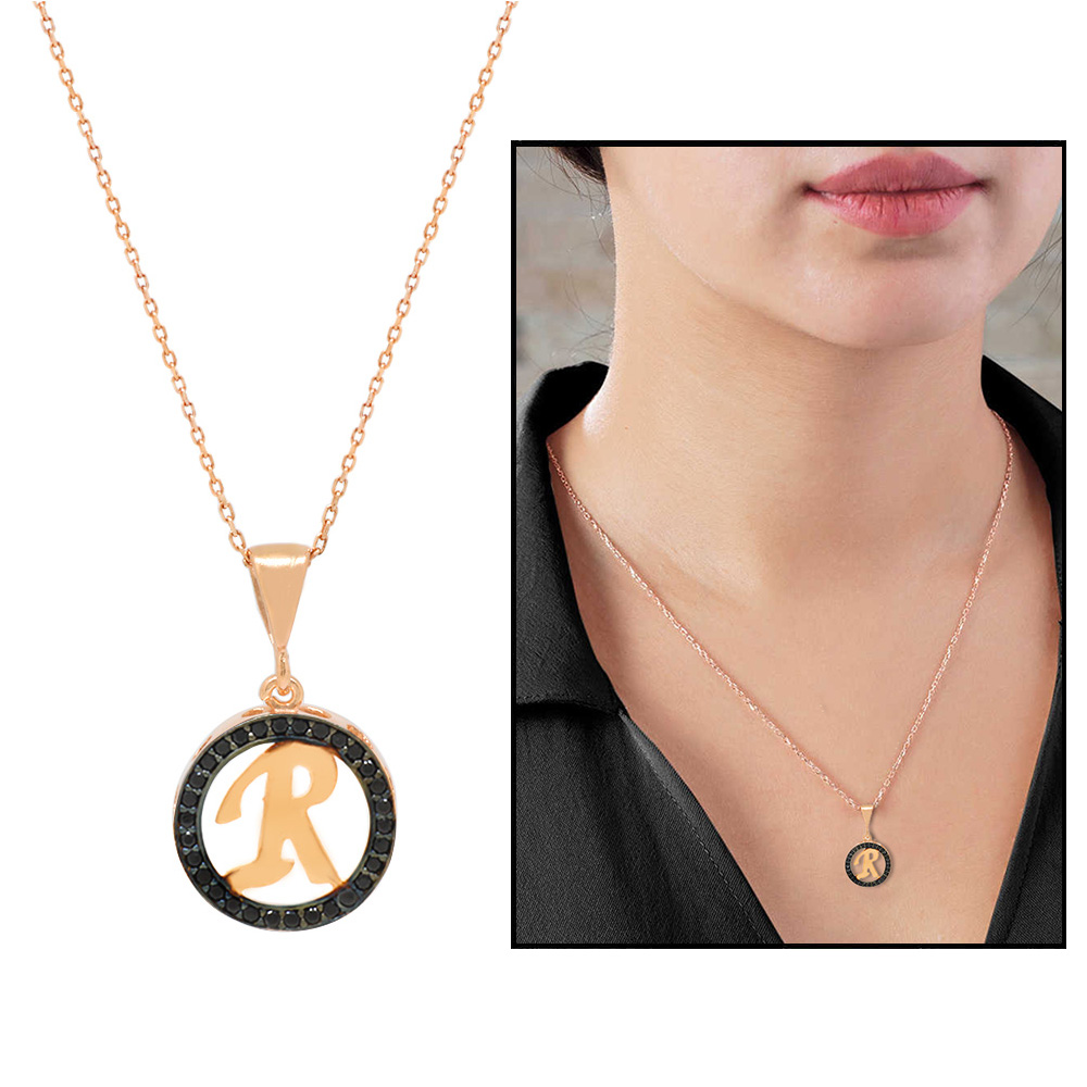 3D Tasarım Siyah Zirkon Taşlı 925 Ayar Gümüş Harf Kolye R