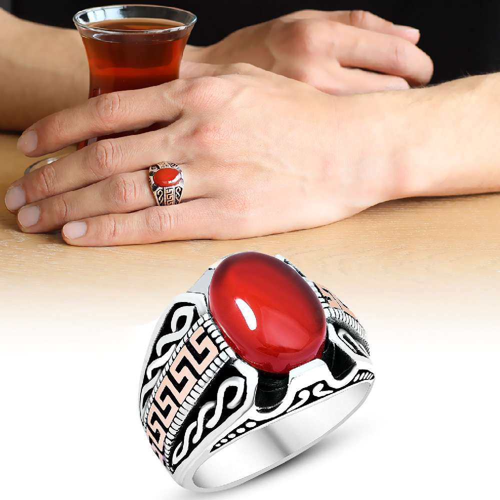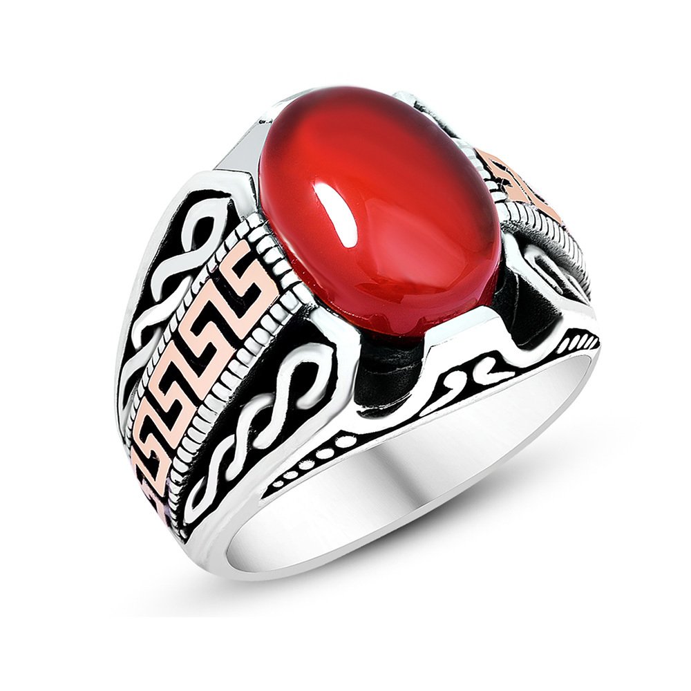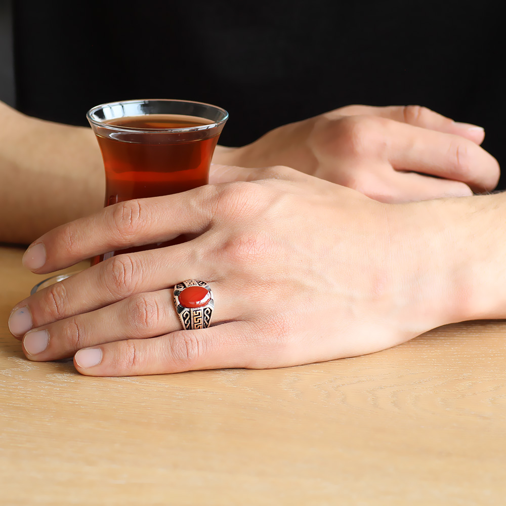 Sarmal İşlemeli Kırmızı Akik Taşlı 925 Ayar Gümüş Erkek Yüzük