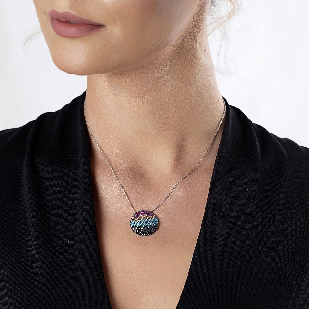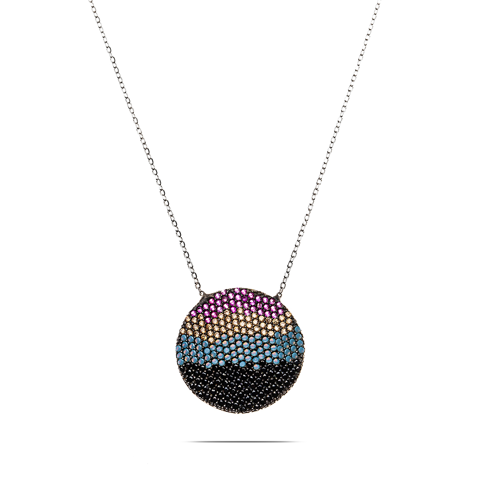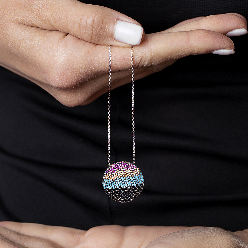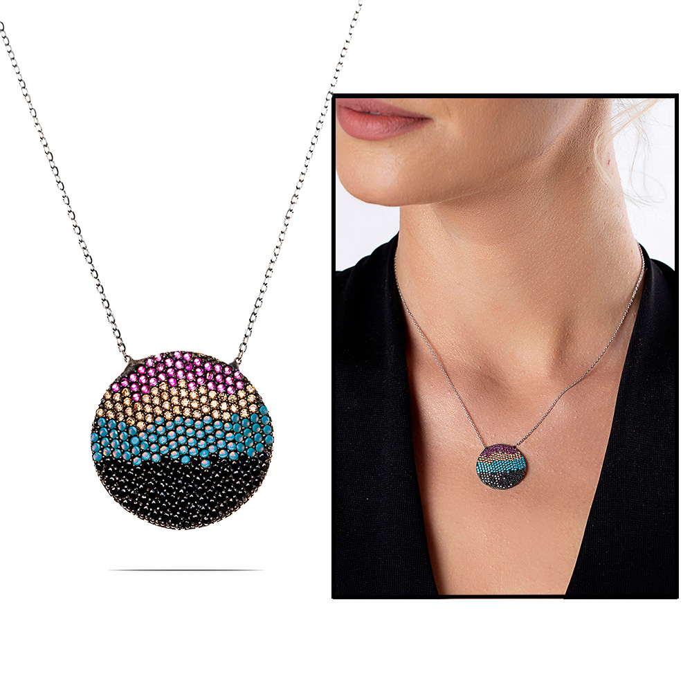 Renkli Zirkon Taşlı Daire Tasarım 925 Ayar Gümüş Bayan Kolye