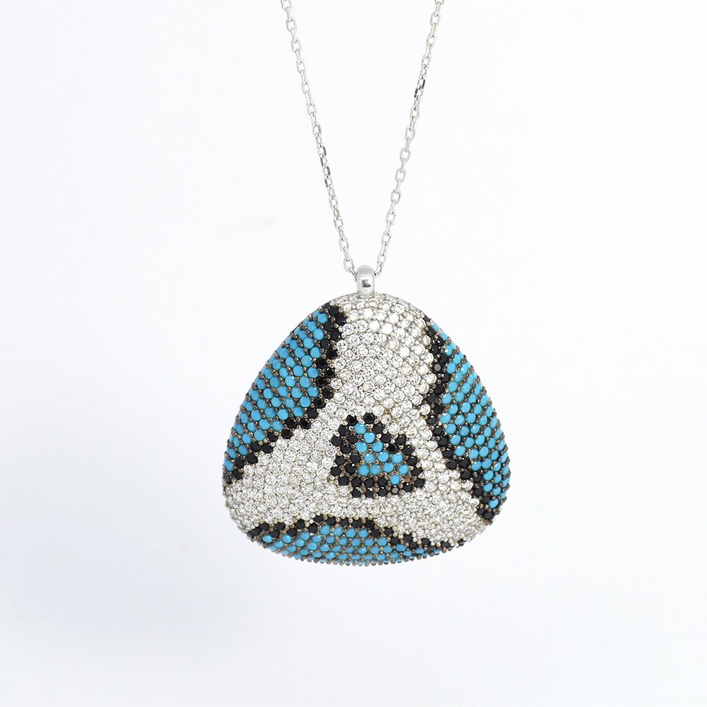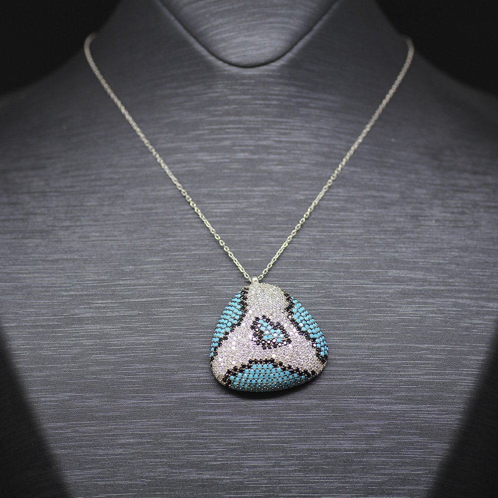 Renkli Zirkon Taşlı Oval Üçgen Tasarım 925 Ayar Gümüş Bayan Kolye - 1