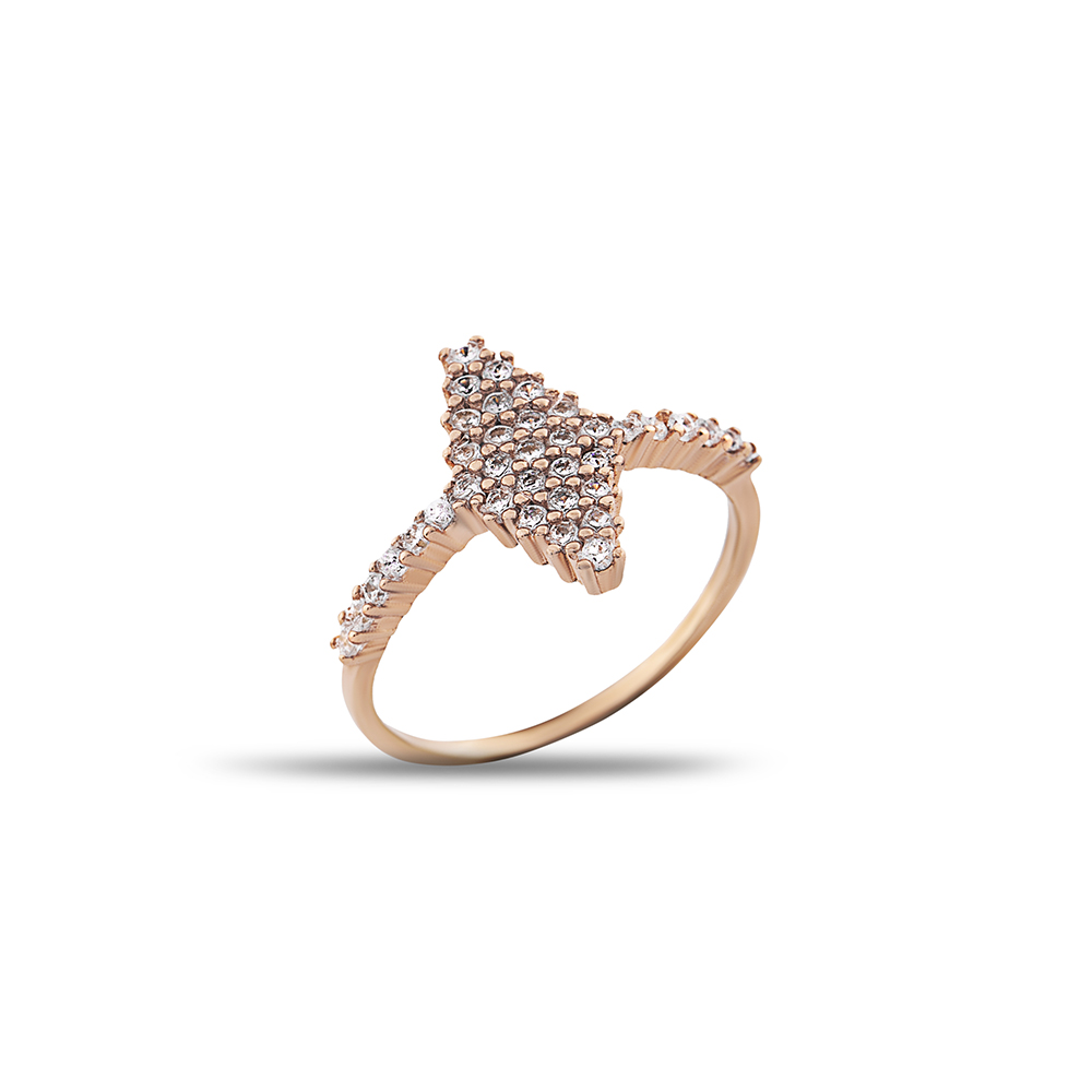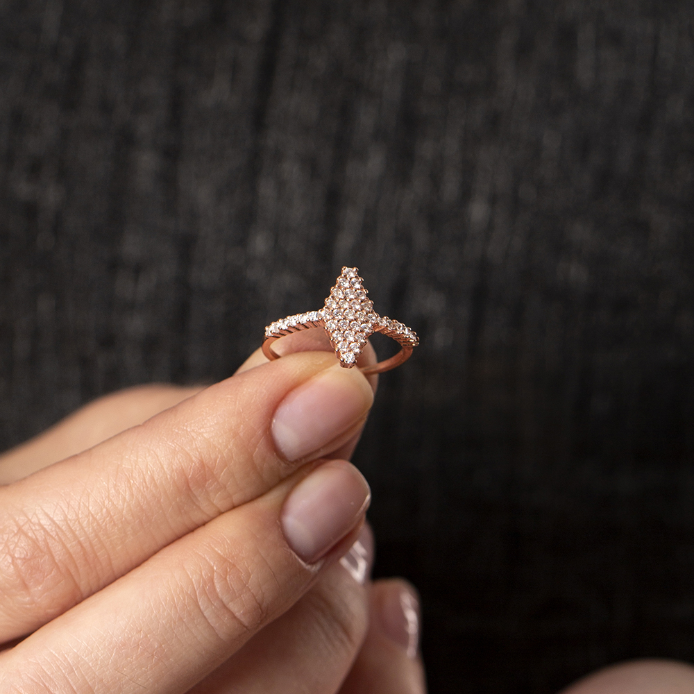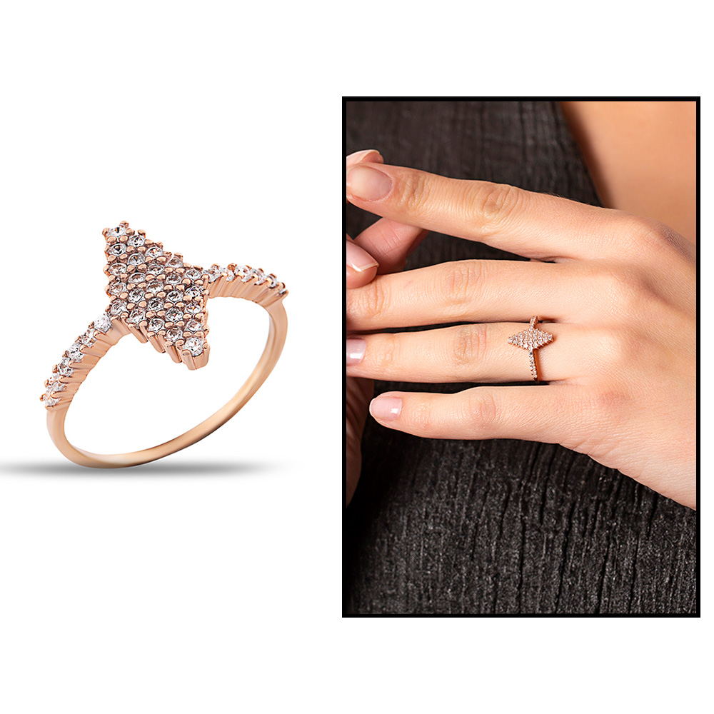 925 Ayar Gümüş Beyaz Zirkon Taşlı Baklava Tasarım Yarım Tur Bayan Yüzük