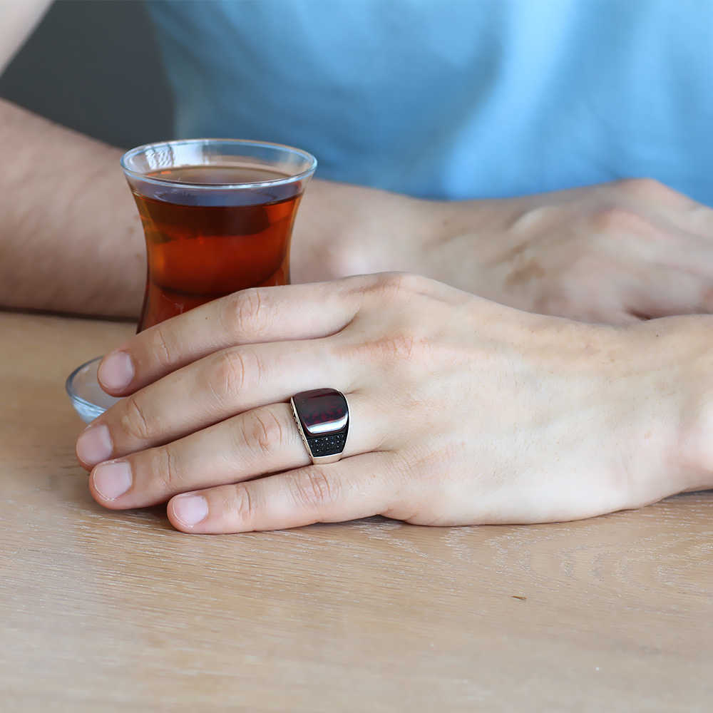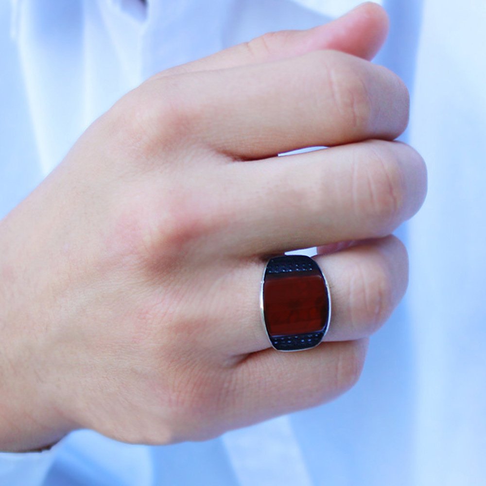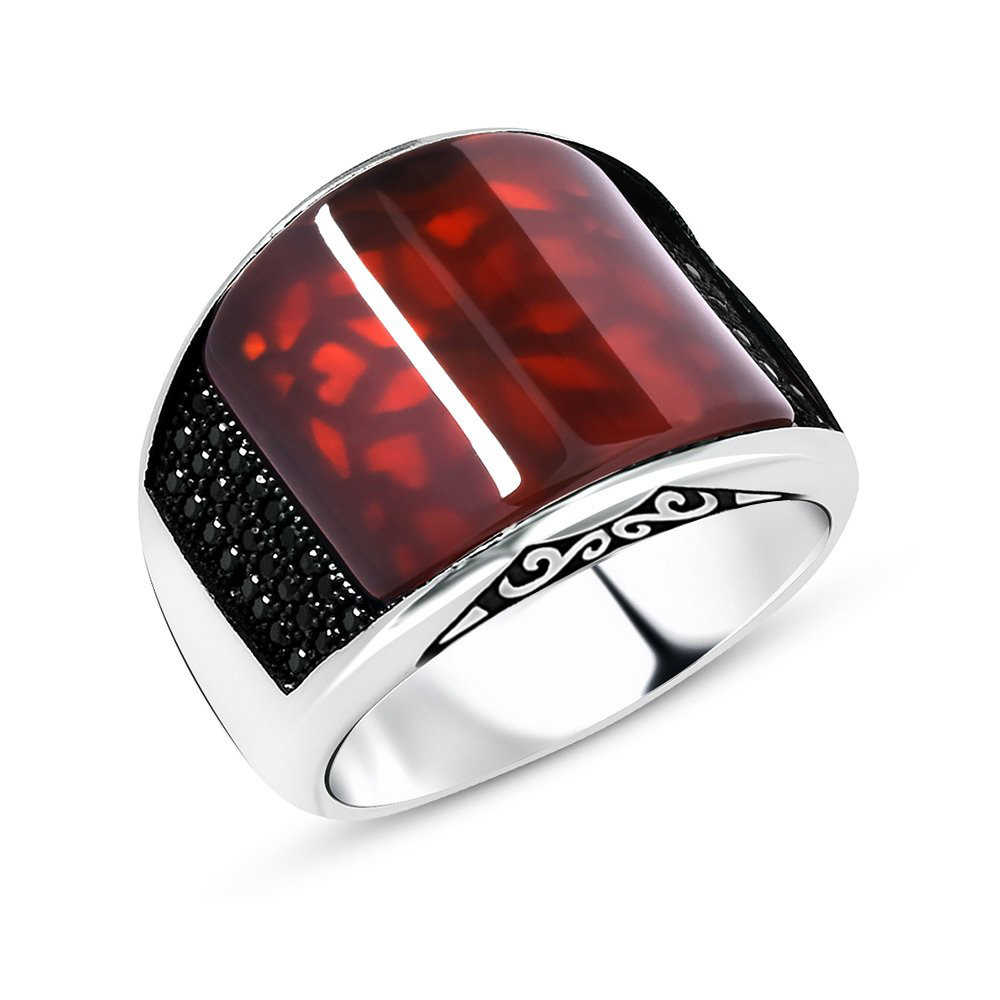 Zirkon Taş İşlemeli Bombeli Akik Taşlı 925 Ayar Gümüş Erkek Yüzük