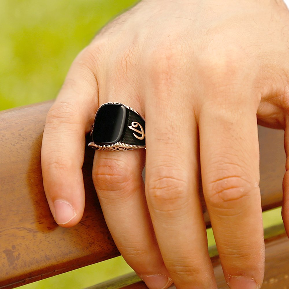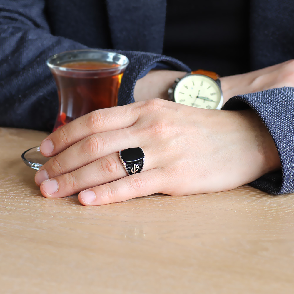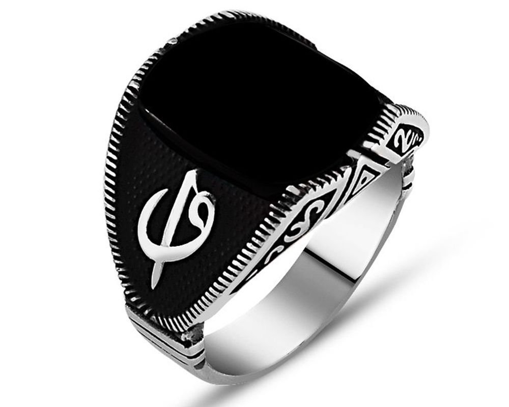 Elif Vav Yazılı Siyah Oniks Taşlı 925 Ayar Gümüş Erkek Yüzük