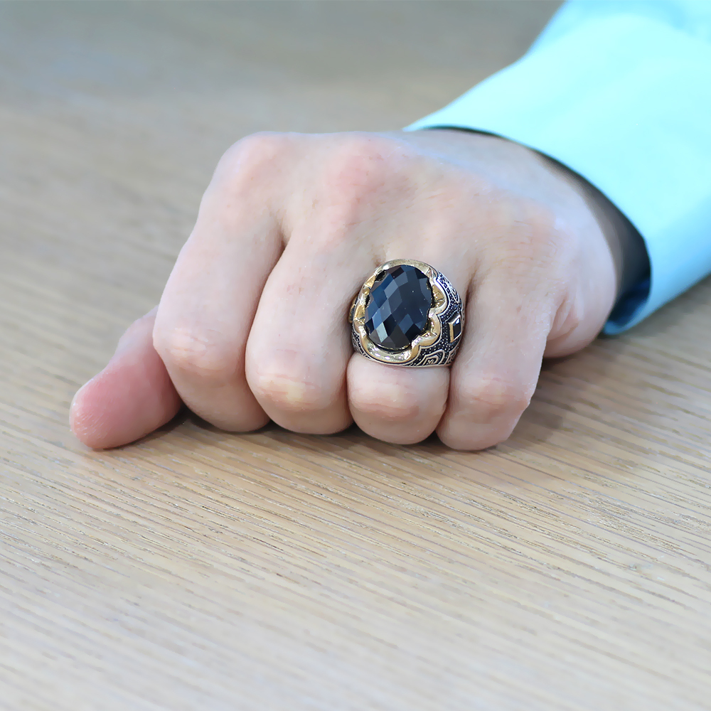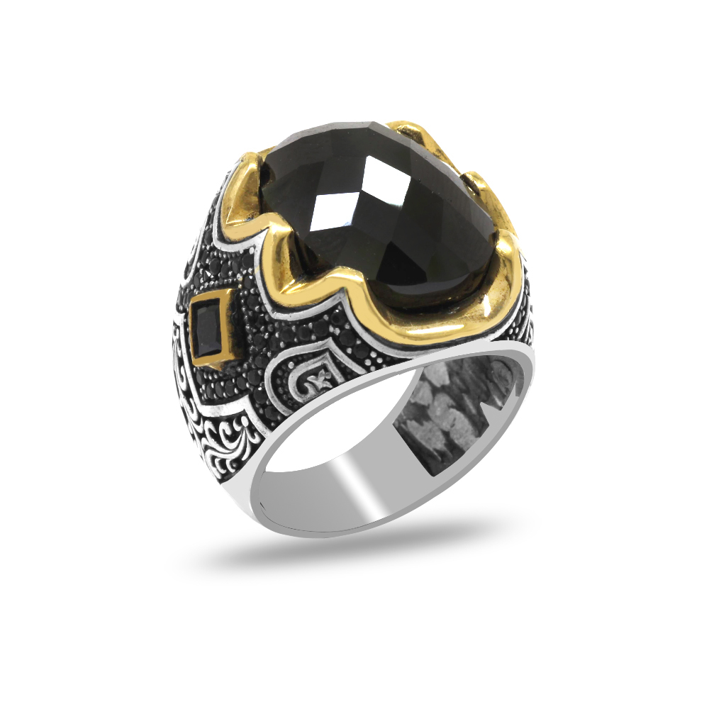 925 Ayar Gümüş Erkek Yüzük - Siyah Zirkon Taşlı - Yanları Gravür İşlemeli