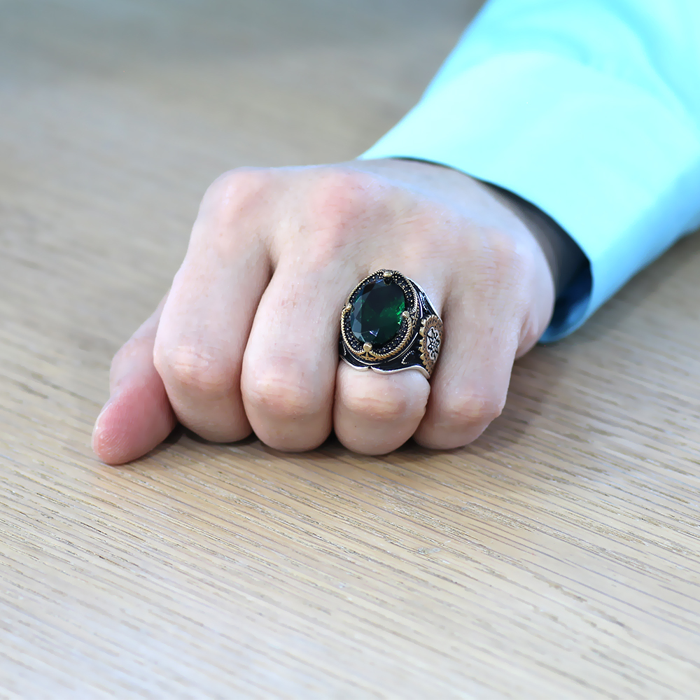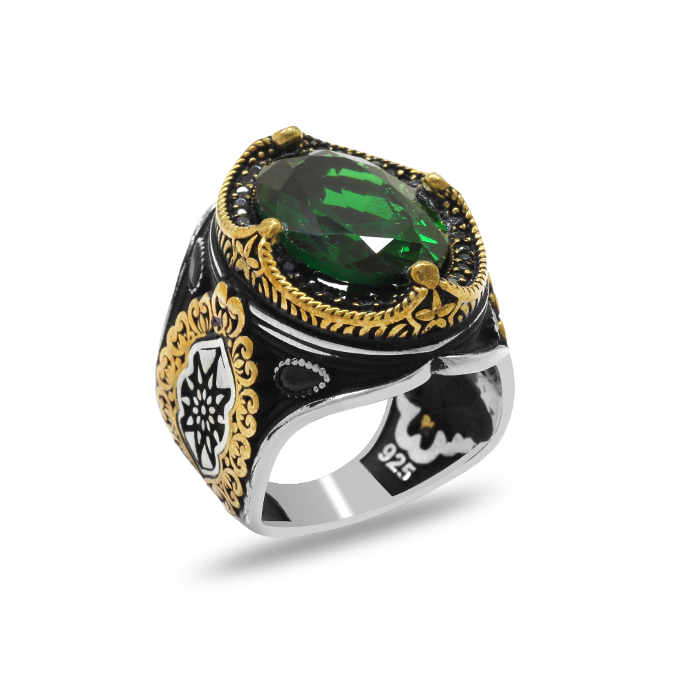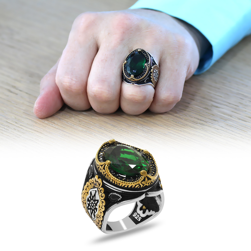 925 Ayar Gümüş Erkek Yüzük - Yeşil Zirkon Taşlı - Yanları Güneş Detaylı