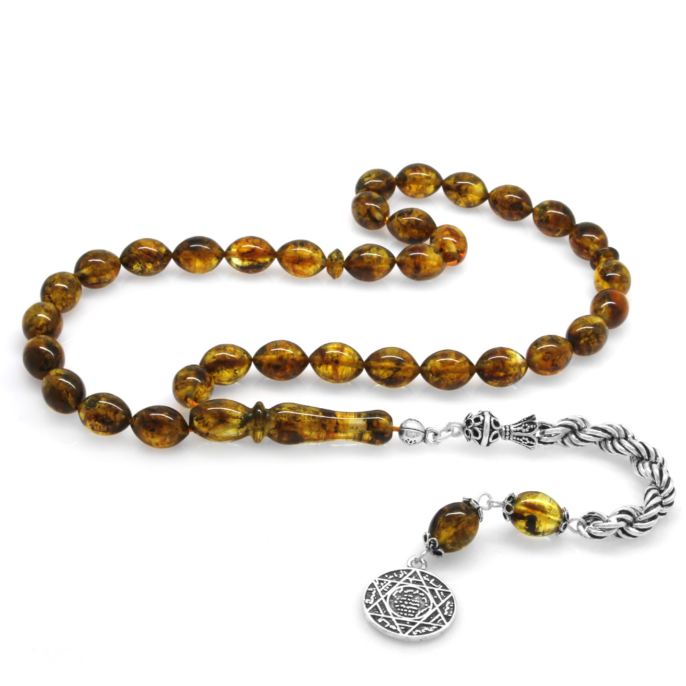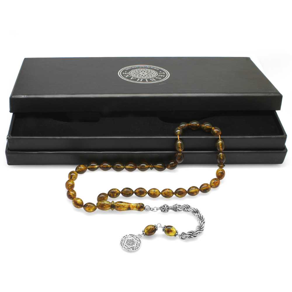925 Ayar Gümüş Halat Püsküllü Arpa Kesim Hareli Sarı Damla Kehribar Tesbih - 1
