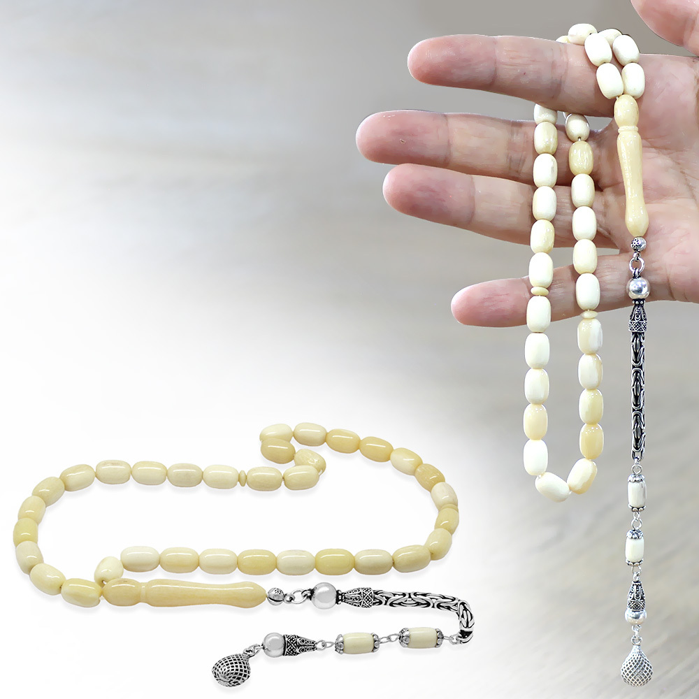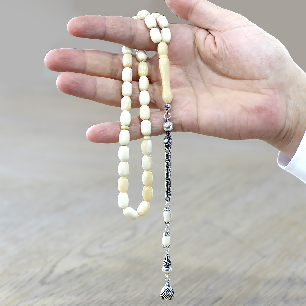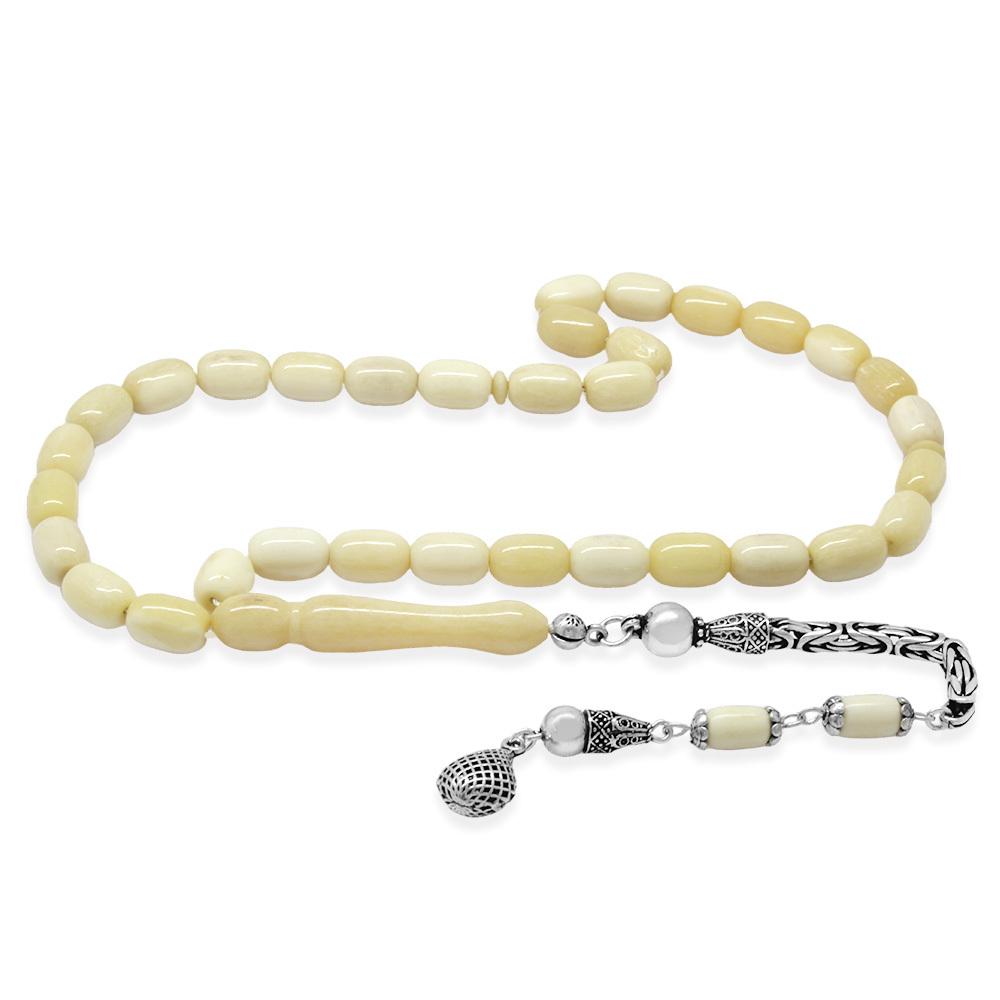 925 Ayar Gümüş Kral Püsküllü Kapsül Kesim Naturel Renk Deve Kemiği Tesbih