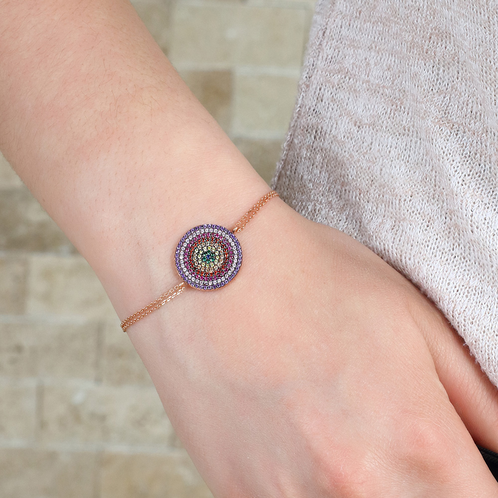 Renkli Zirkon Taşlı Yuvarlak Tasarım 925 Ayar Gümüş Bayan Bileklik