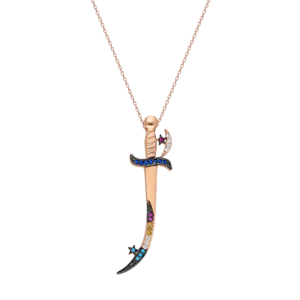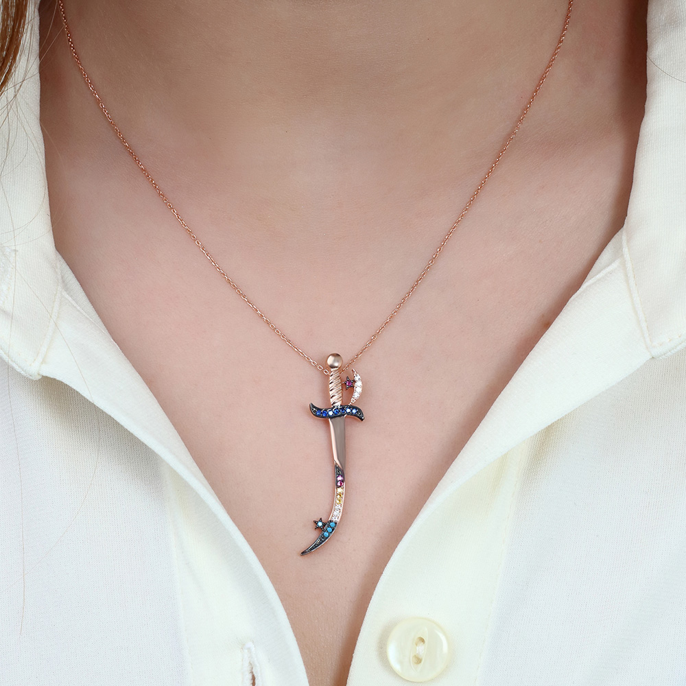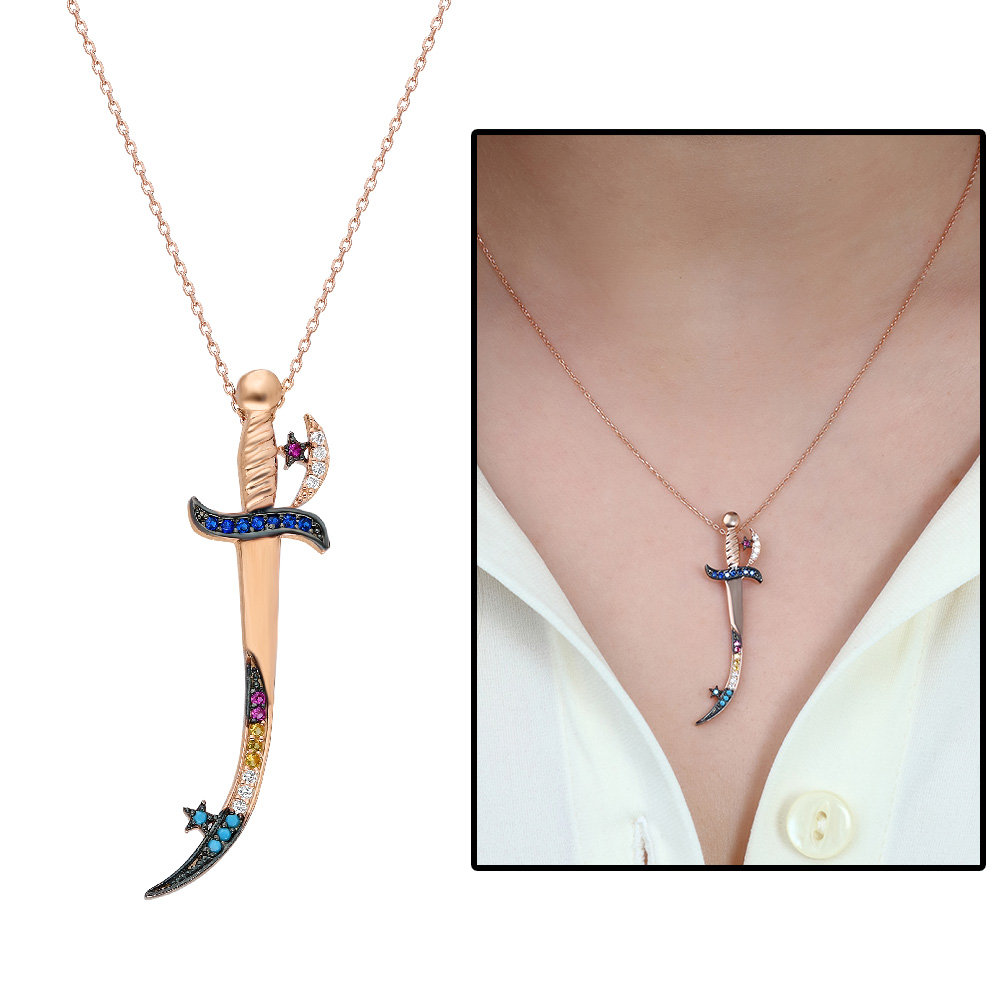 Renkli Zirkon Taşlı Kılıç Tasarım 925 Ayar Gümüş Bayan Kolye