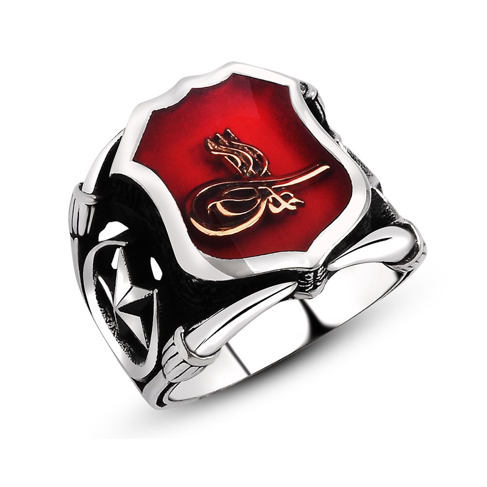 925 Ayar Gümüş Kırmızı Mine Üzerine Tuğra İşlemeli Yüzük
