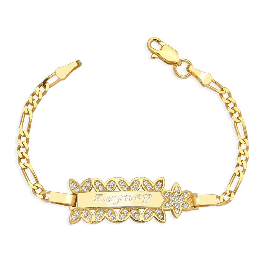 925 Ayar Gümüş Zirkon Taşlı Gold Renk Çiçek Tasarım İsim Yazılı Çocuk Bileklik