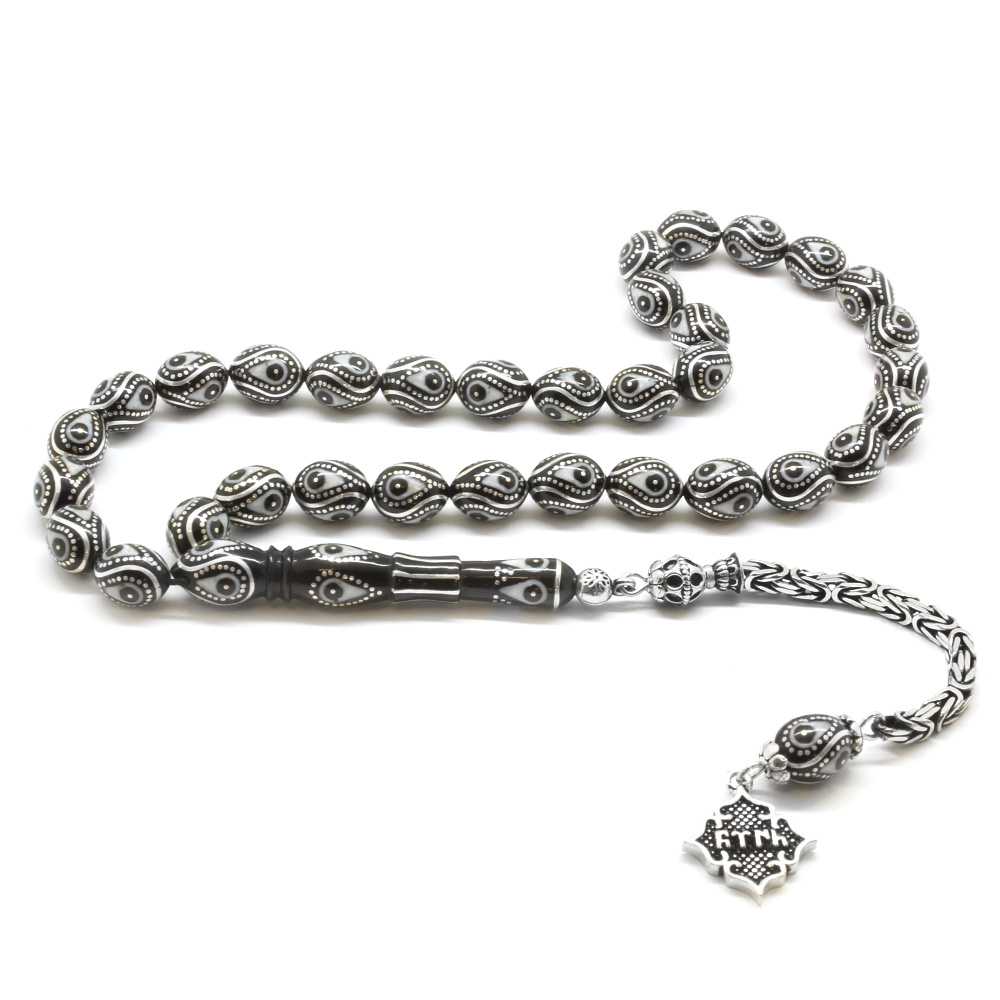 925 Ayar Gümüş Kral Püsküllü Gümüş İşlemeli Mine İşlemeli Erzurum Oltu Taşı Tesbih - 2