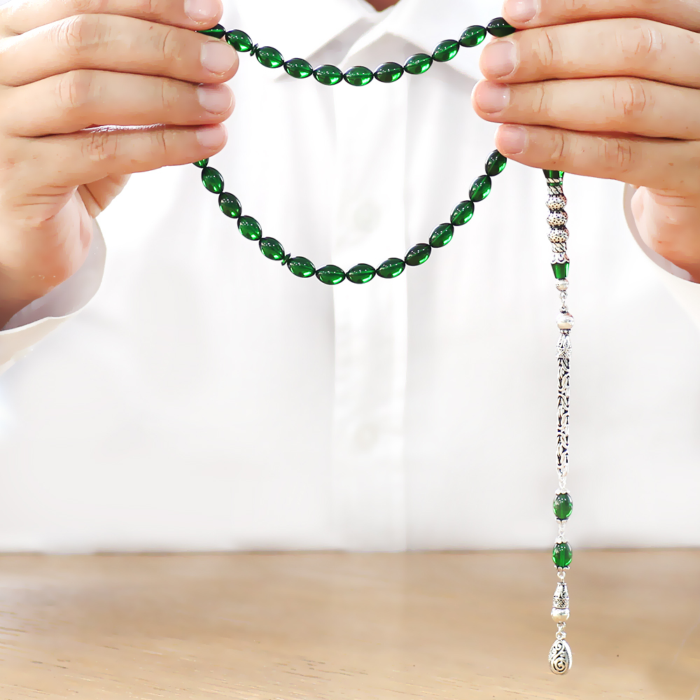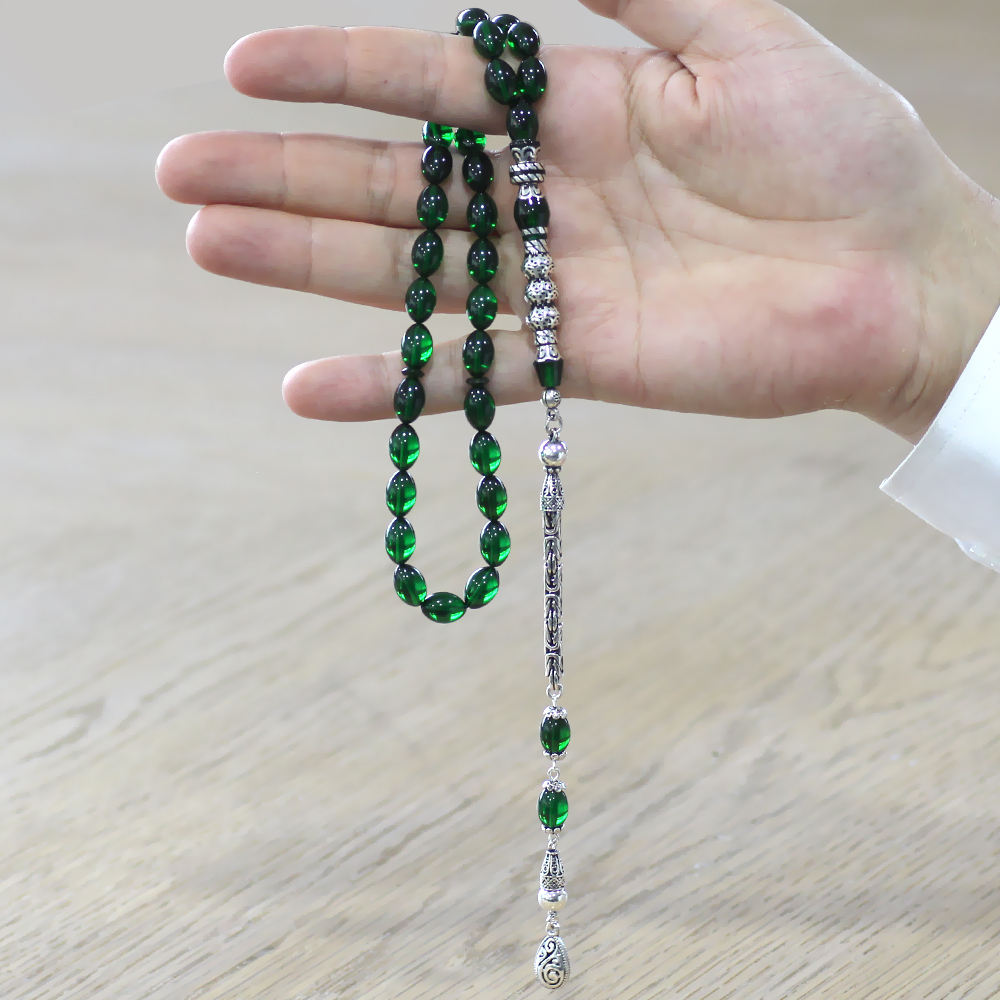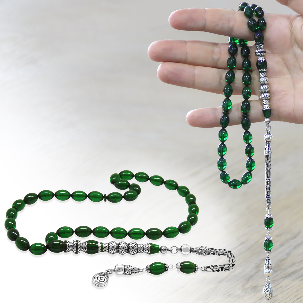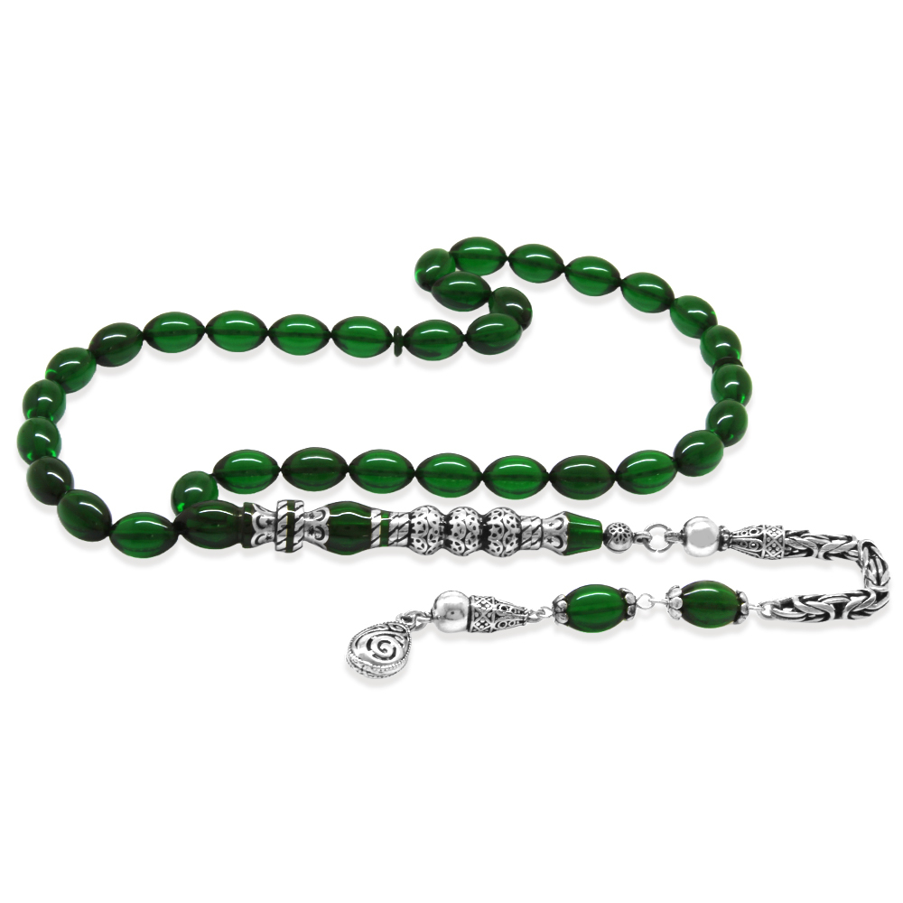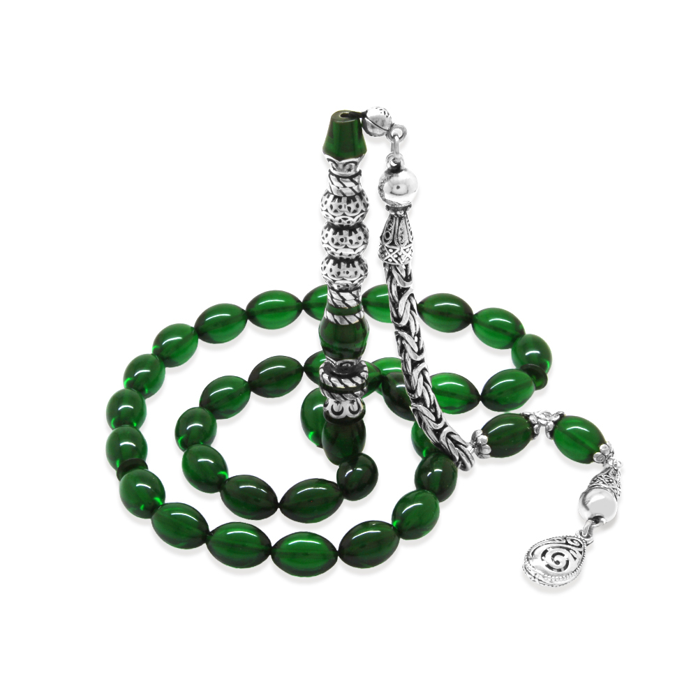 925 Ayar Gümüş Kral Püsküllü Gümüş Üç Şerefeli Nakkaş İmameli Yeşil Ateş Kehribar Tesbih