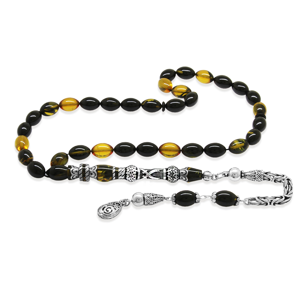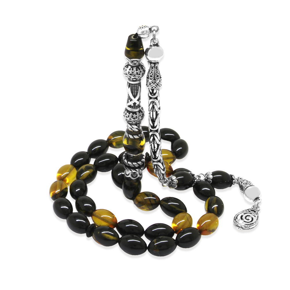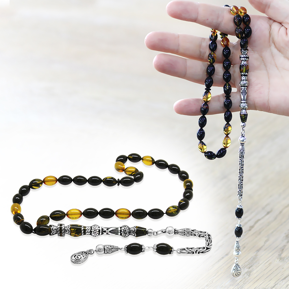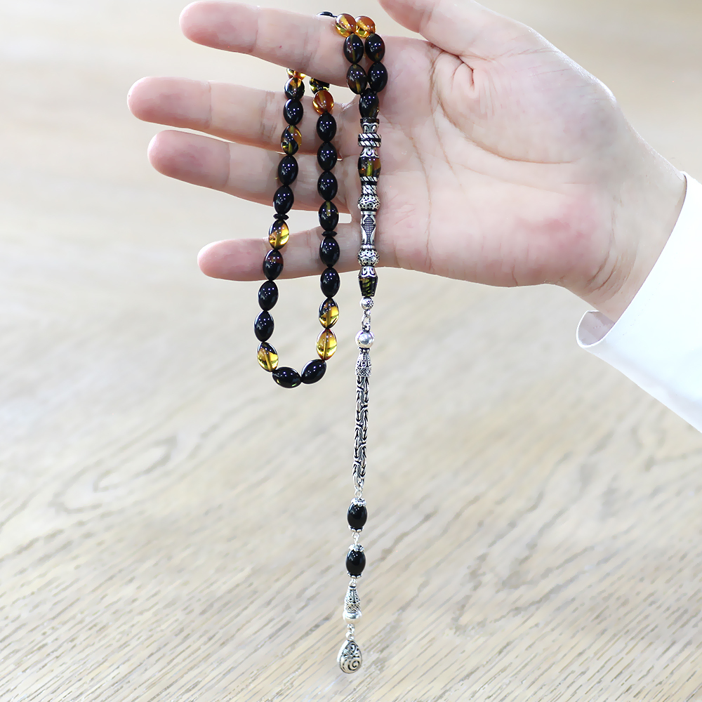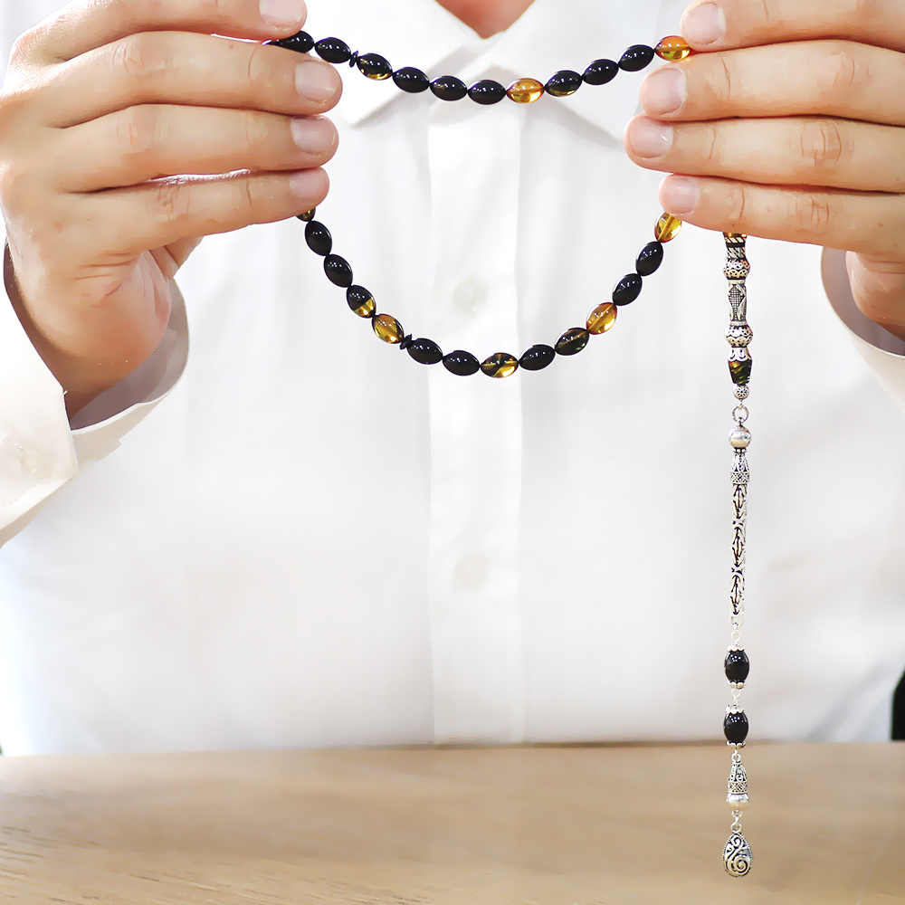 925 Ayar Gümüş Kral Püsküllü Nakkaş İmameli Zülfikar Tasarım Sarı Siyah Ateş Kehribar Tesbih