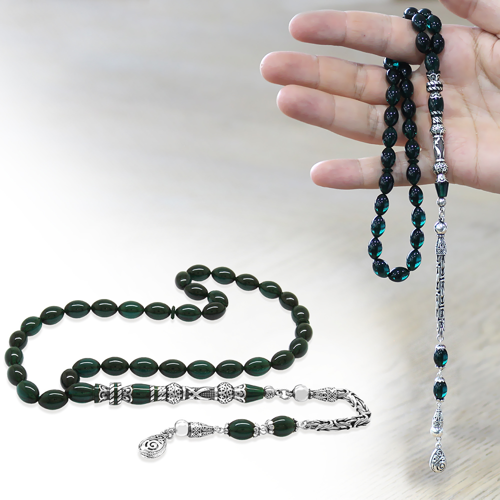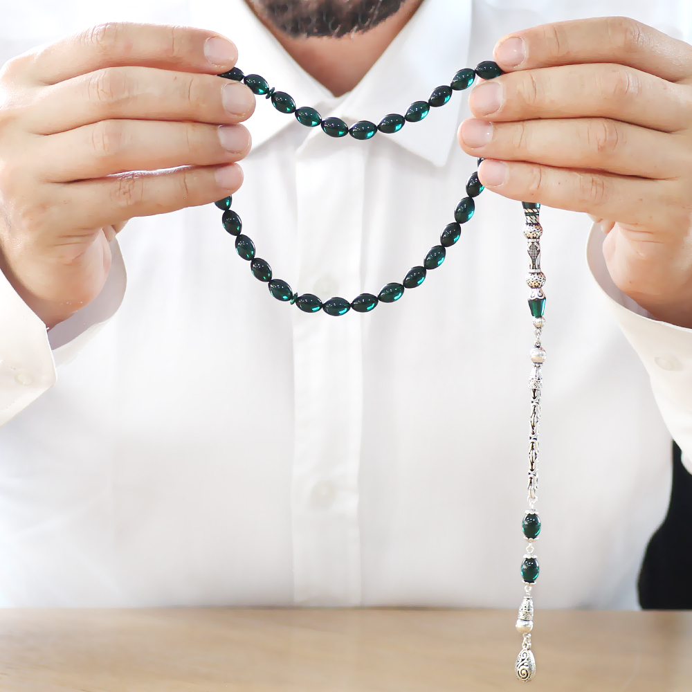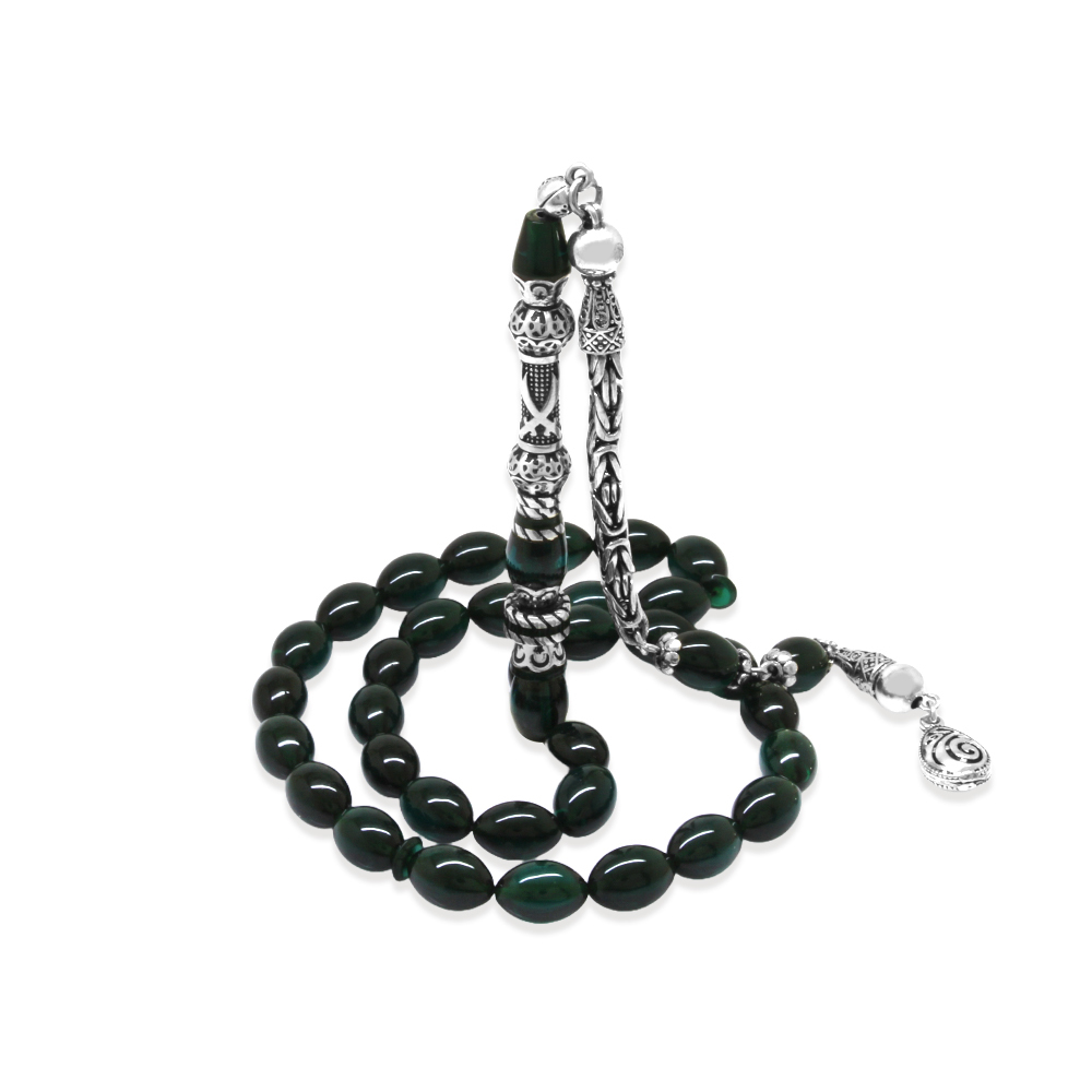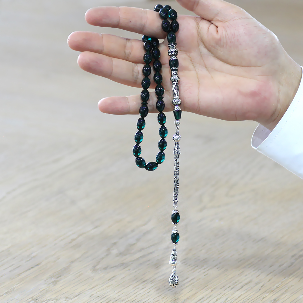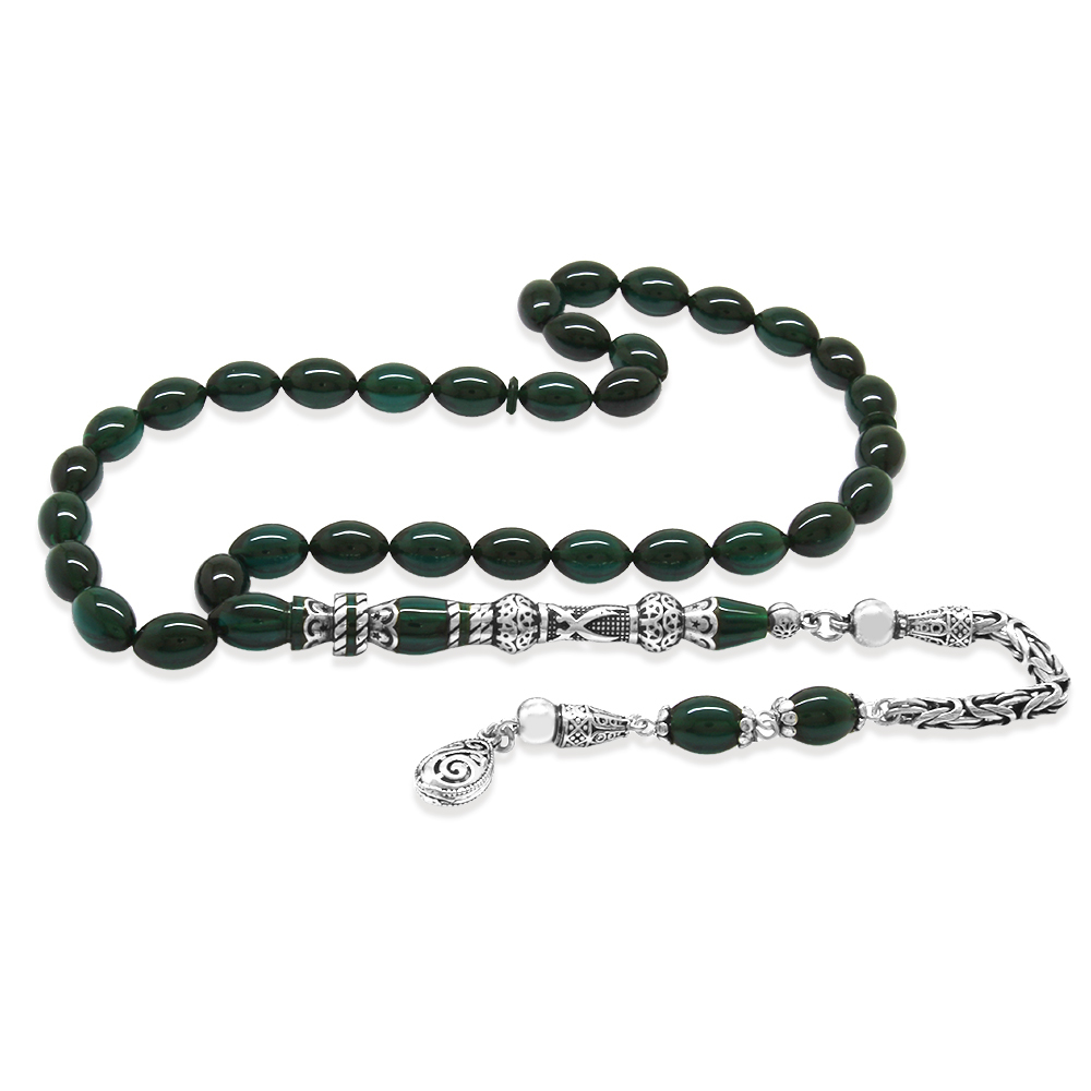 925 Ayar Gümüş Kral Püsküllü Nakkaş İmameli Zülfikar Tasarım Turkuaz Ateş Kehribar Tesbih