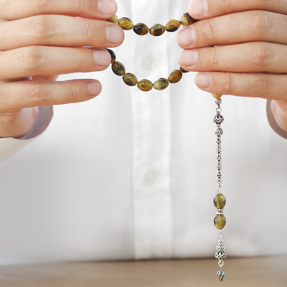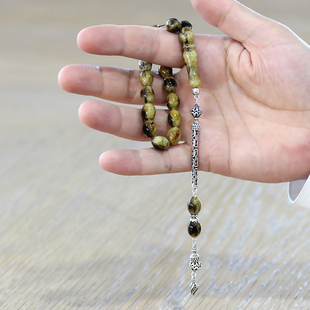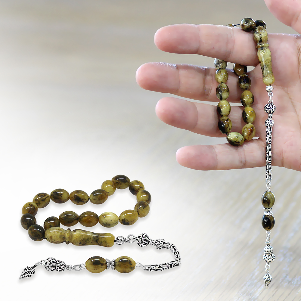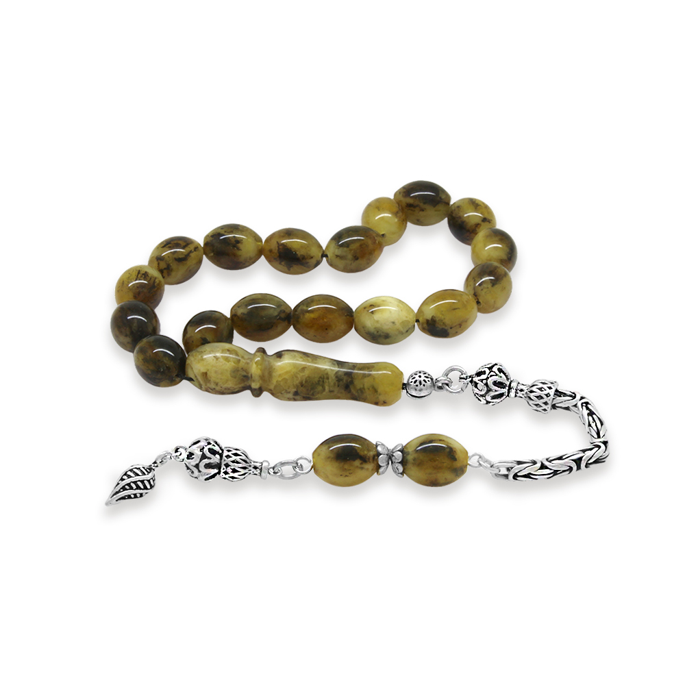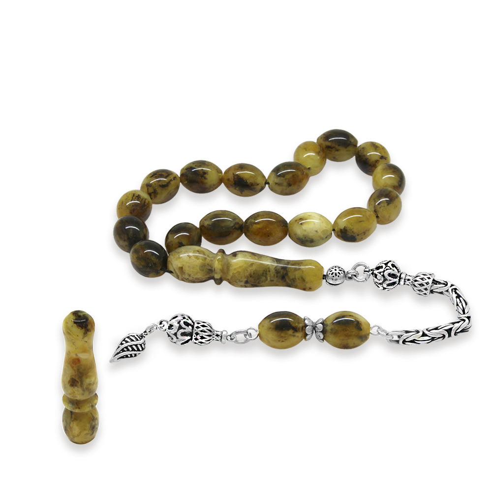 925 Ayar Gümüş Kral Zincir Püsküllü Arpa Kesim Dalmaçya Damla Kehribar Dört Parmak Efe Tesbih