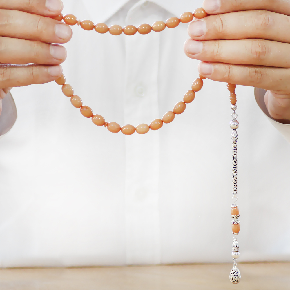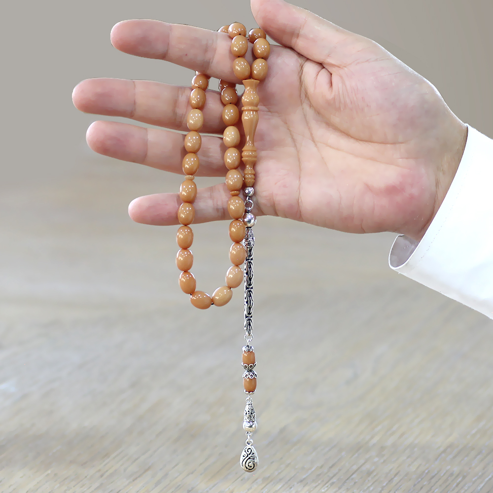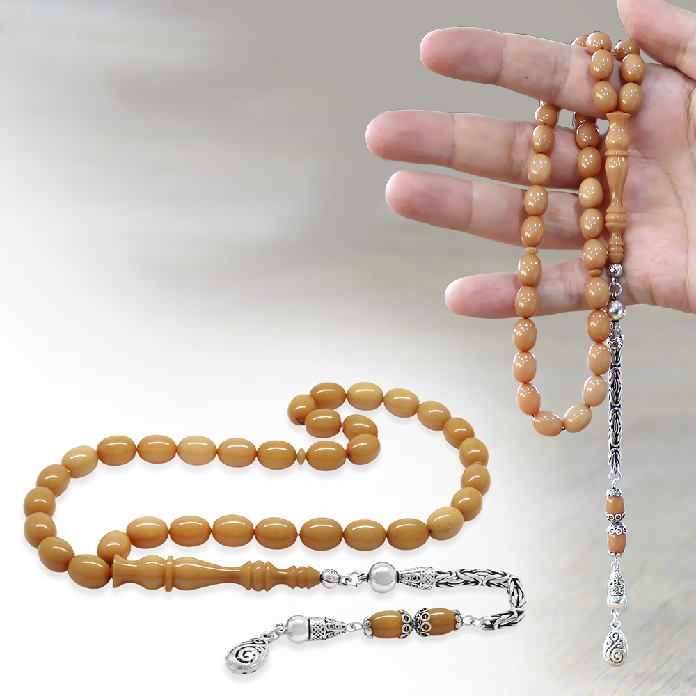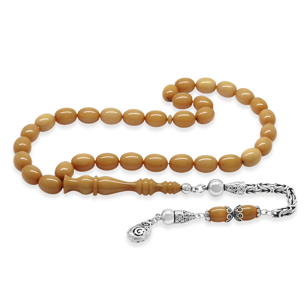 925 Ayar Gümüş Kral Zincir Püsküllü Arpa Kesim Krem Rengi Sıkma Kehribar Tesbih