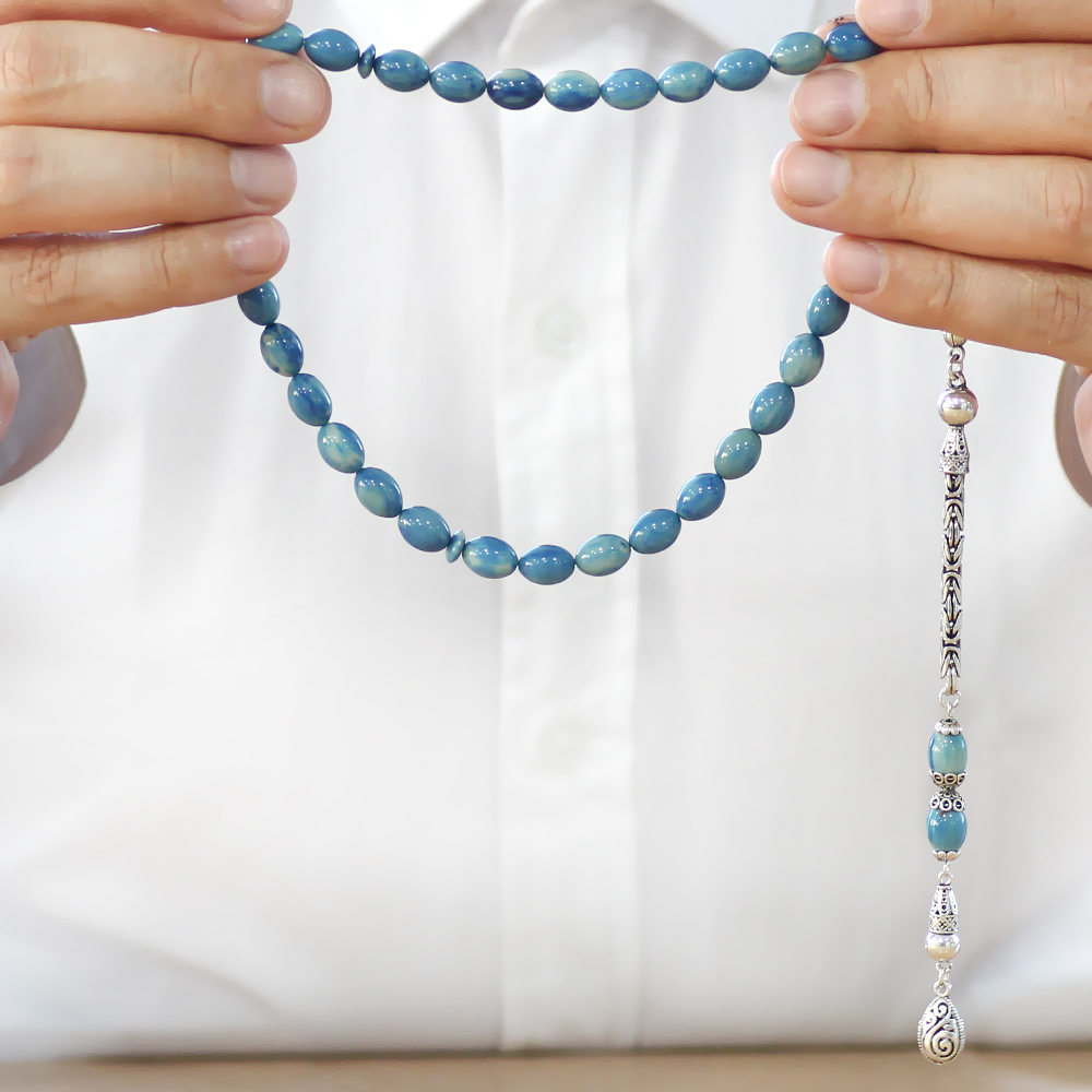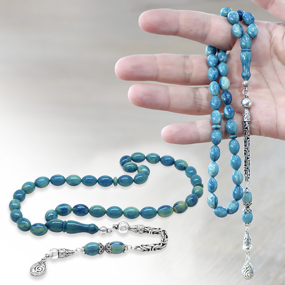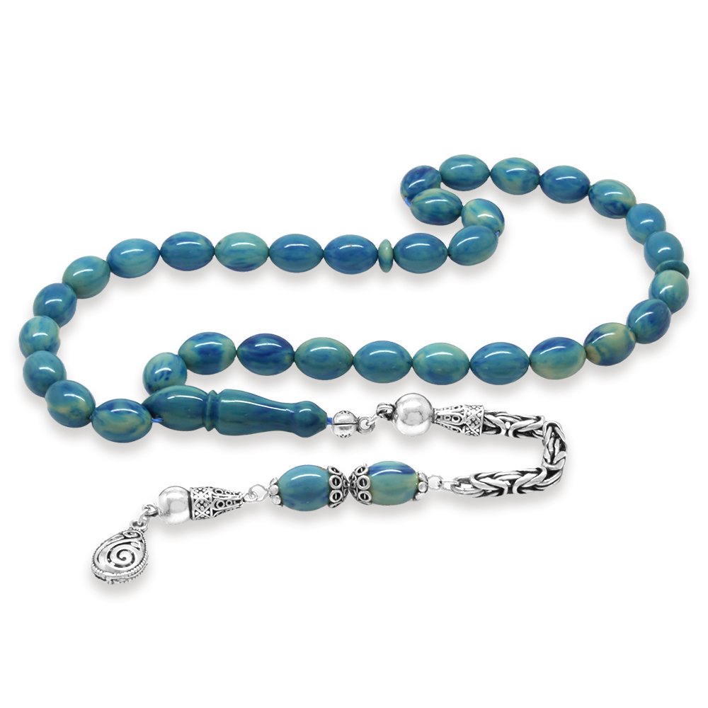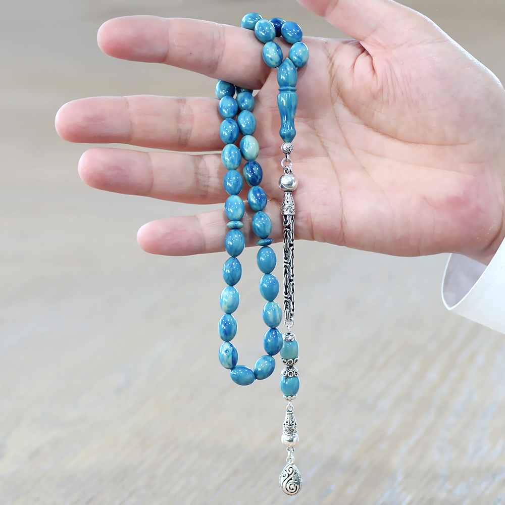 925 Ayar Gümüş Kral Zincir Püsküllü Arpa Kesim Turkuaz-Mavi Sıkma Kehribar Tesbih