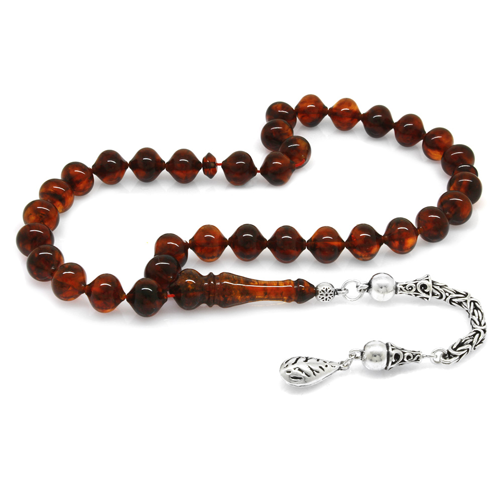 925 Ayar Gümüş Kral Zincir Püsküllü İstanbul Kesim Bitki Fosilli Damla Kehribar Tesbih - 2
