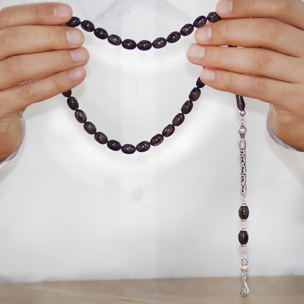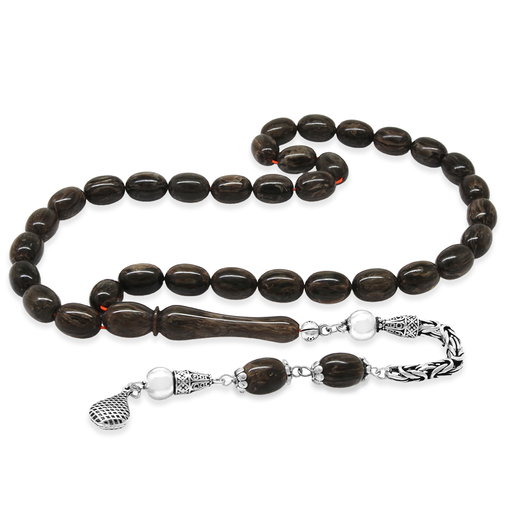 925 Ayar Gümüş Kral Zincir Püsküllü Sülün İmame Beyzi Kesim Gri - Siyah Katalin Tesbih