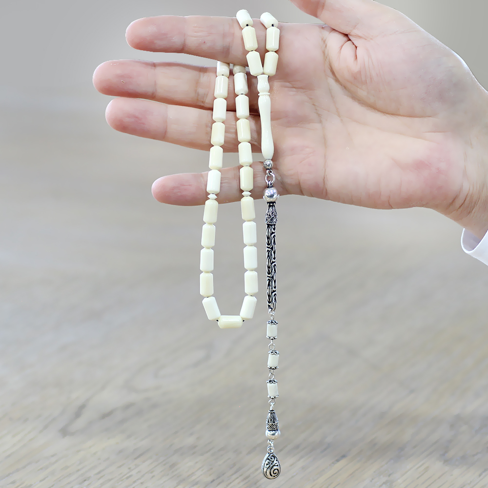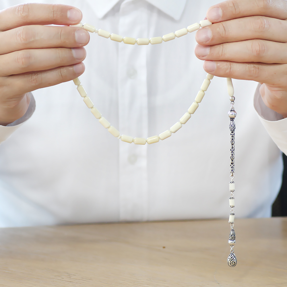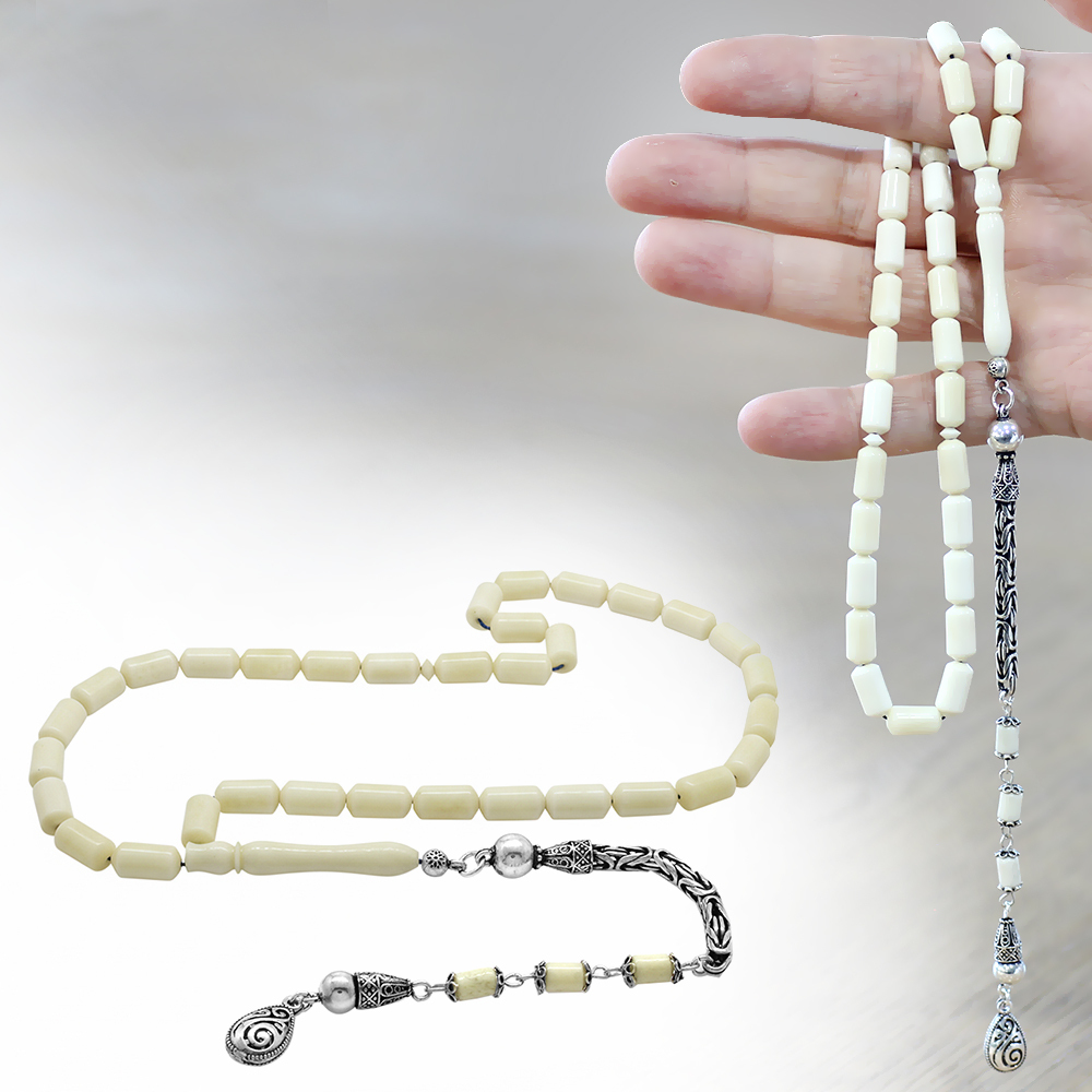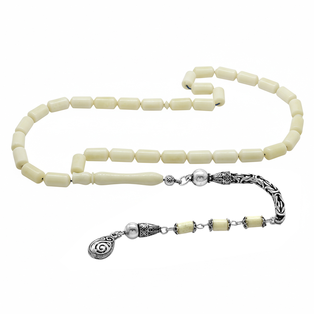 925 Ayar Gümüş Kral Zincir Püsküllü Uçlu Kapsül Kesim Naturel Renk Deve Kemiği Tesbih