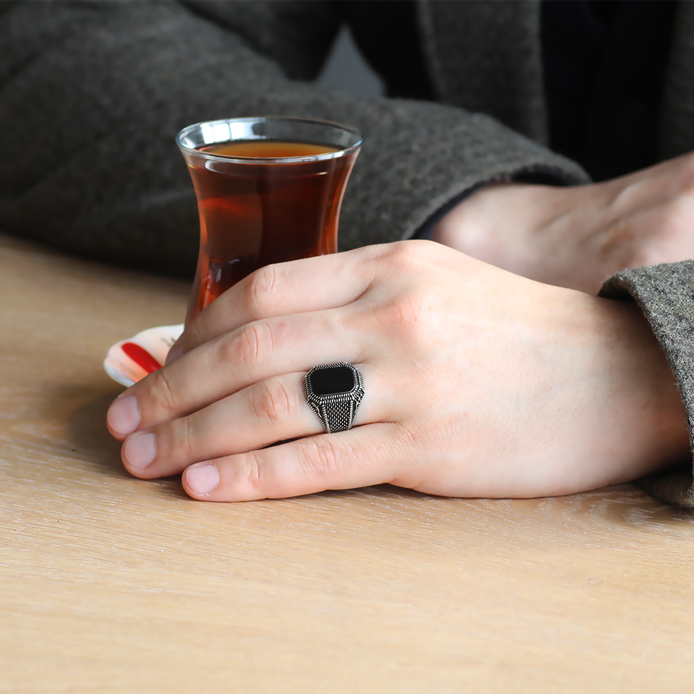 Lale İşlemeli Siyah Oniks Taşlı 925 Ayar Gümüş Erkek Yüzük