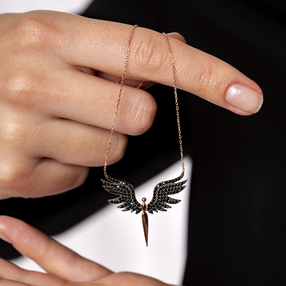 Siyah Zirkon Taşlı Melek Tasarım 925 Ayar Gümüş Bayan Kolye