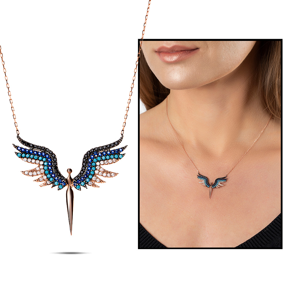 Renkli Zirkon Taşlı Melek Tasarım 925 Ayar Gümüş Bayan Kolye