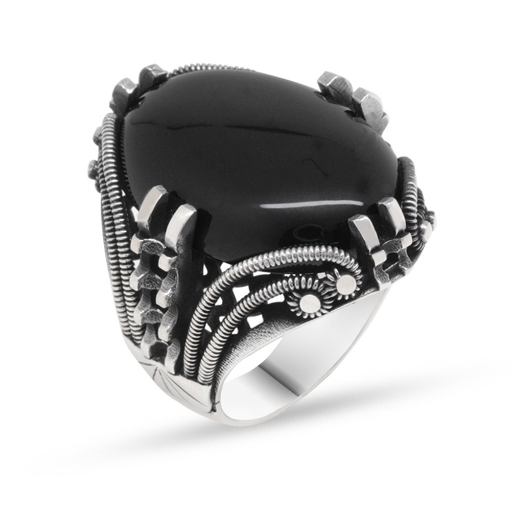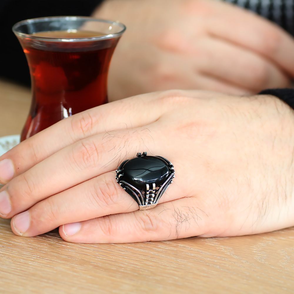 Tırnak Tasarım Siyah Oniks Taşlı 925 Ayar Gümüş Erkek Yüzük