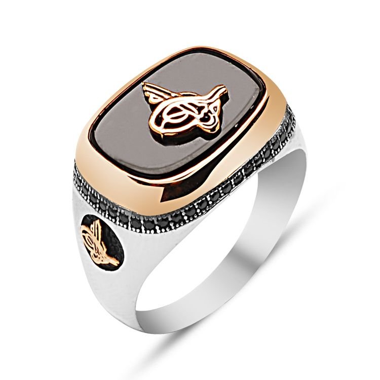 Ürün Adı | Tuğra Motifli Oniks -Zirkon Taşlı 925 Ayar Gümüş Erkek Yüzük |