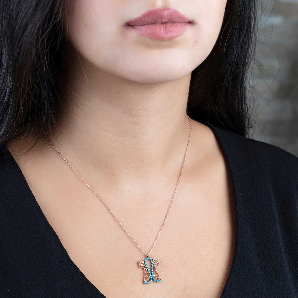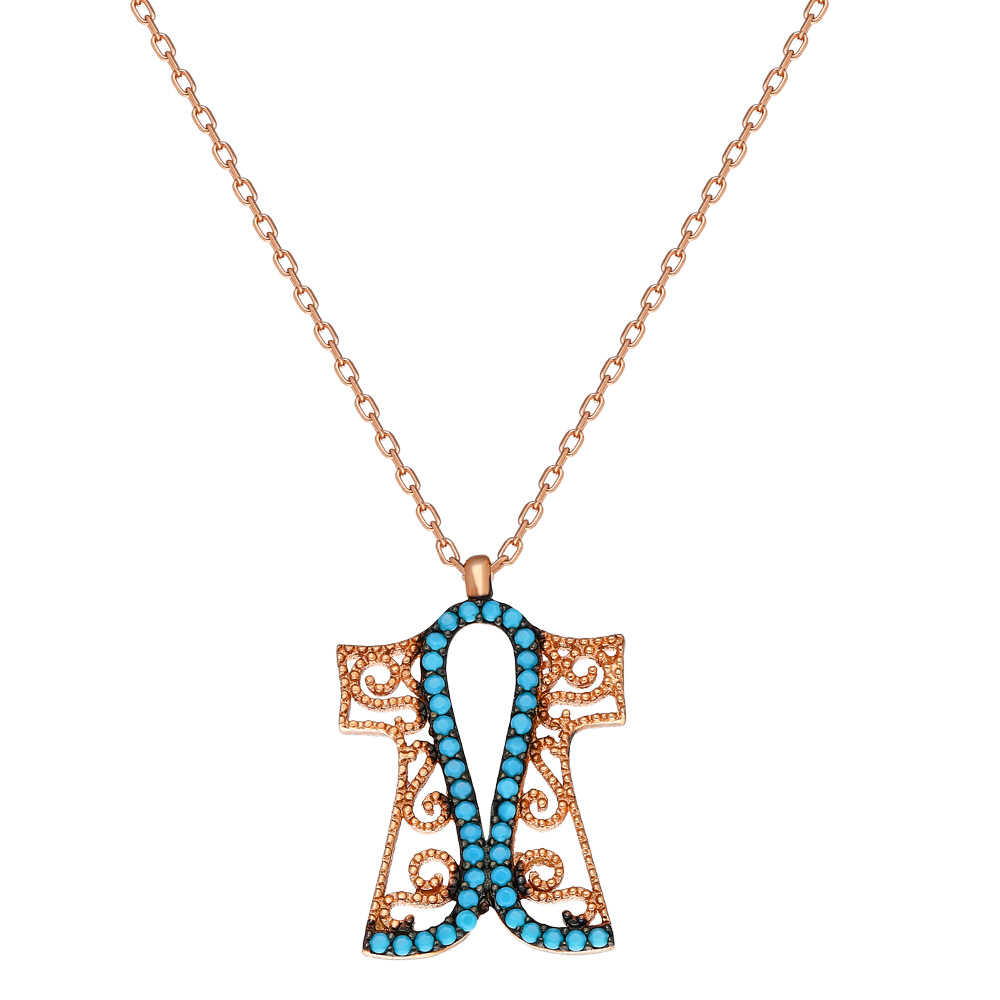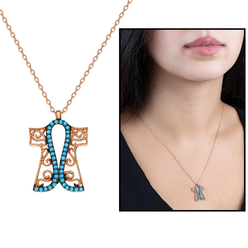 Turkuaz Taşlı Altın Renk Kaftan Tasarım 925 Ayar Gümüş Bayan Kolye