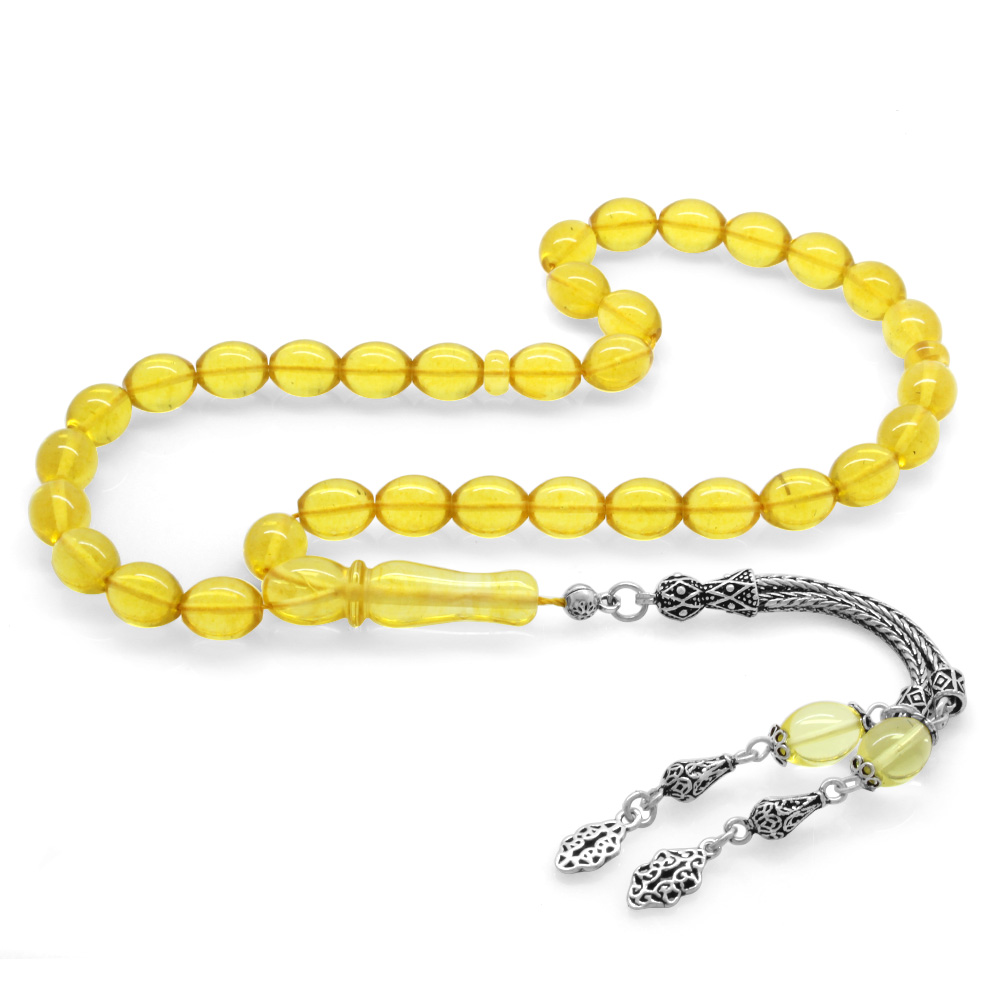 925 Ayar Gümüş Püsküllü Arpa Kesim Şeffaf Sarı Damla Kehribar Tesbih
