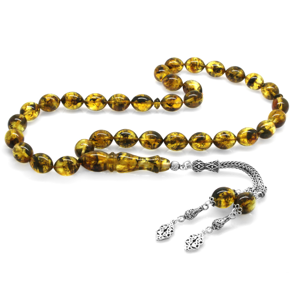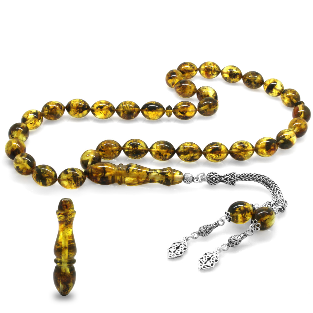 925 Ayar Gümüş Püsküllü Arpa Kesim Fosilli Sarı Damla Kehribar Tesbih - 1