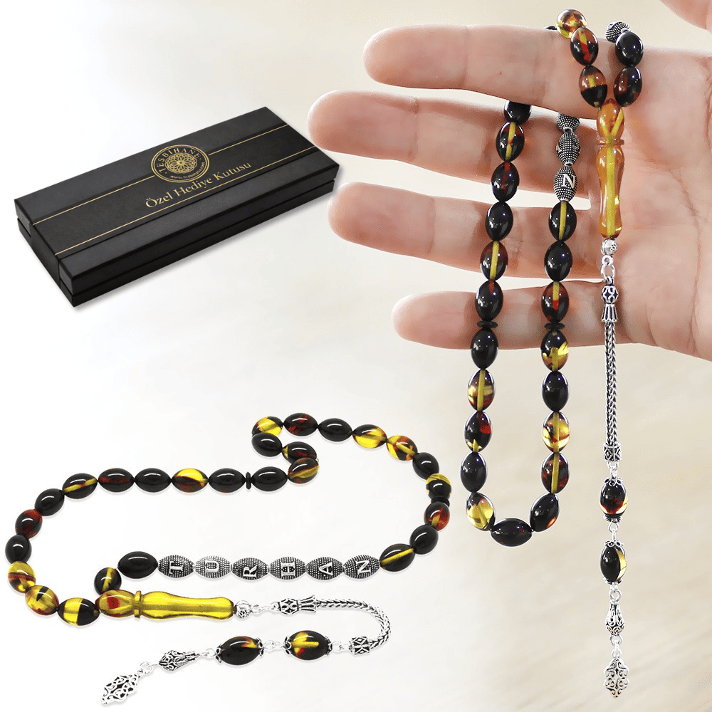 925 Ayar Gümüş Püsküllü Arpa Kesim Gümüş İsim Yazılı Bala Siyah Ateş Kehribar Tesbih