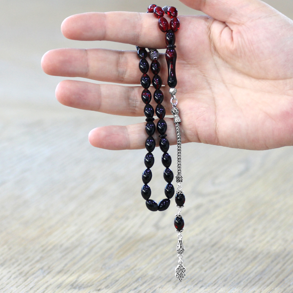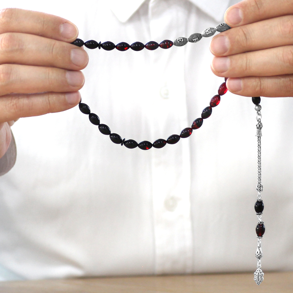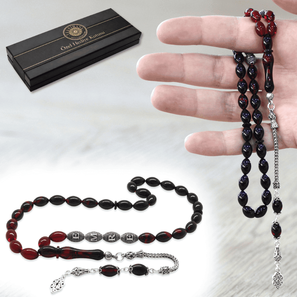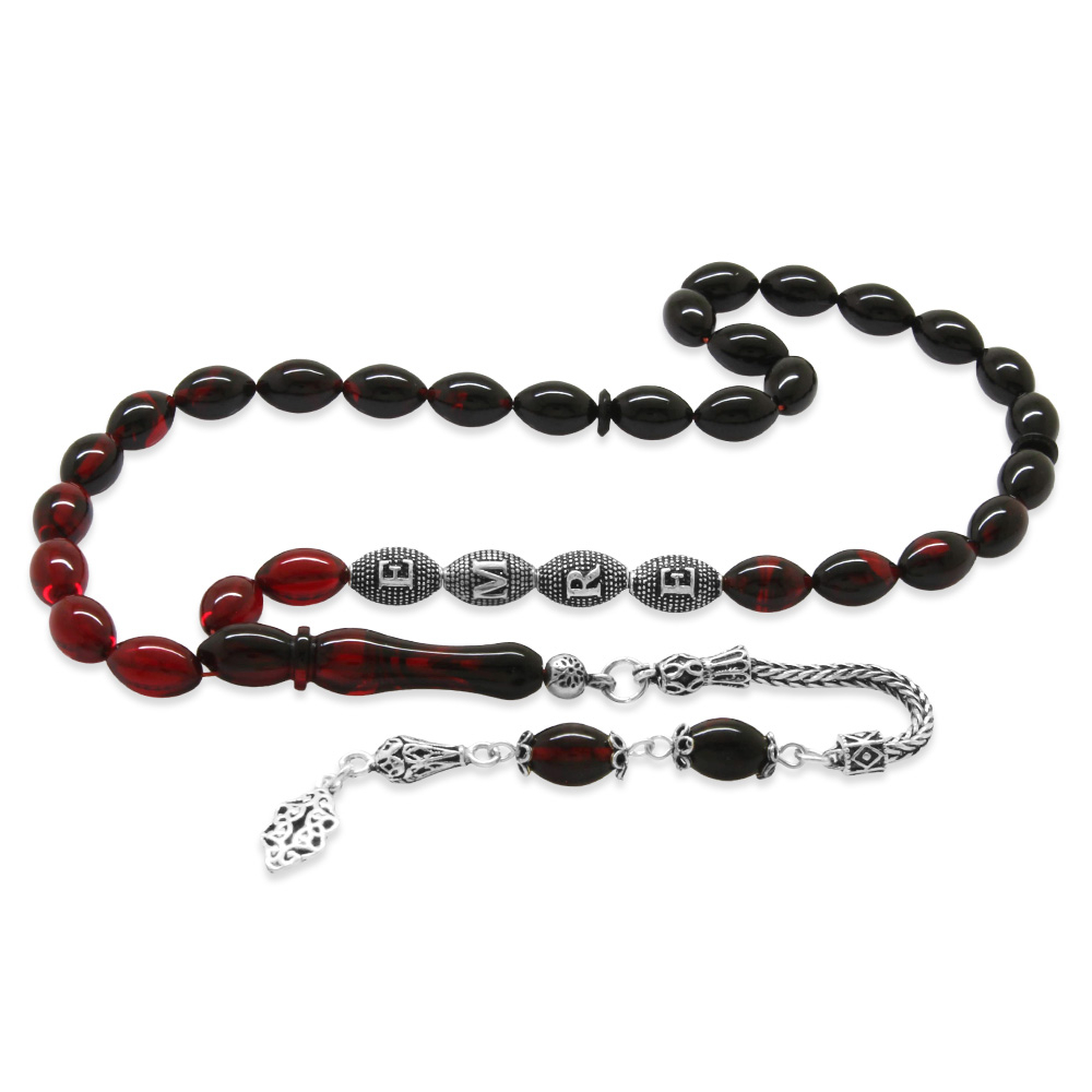 925 Ayar Gümüş Püsküllü Arpa Kesim Gümüş İsim Yazılı Kırmızı Siyah Ateş Kehribar Tesbih