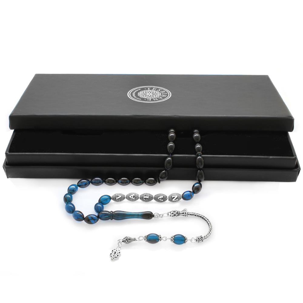 925 Ayar Gümüş Püsküllü Arpa Kesim Gümüş İsim Yazılı Süzme Turkuaz Siyah Ateş Kehribar Tesbih