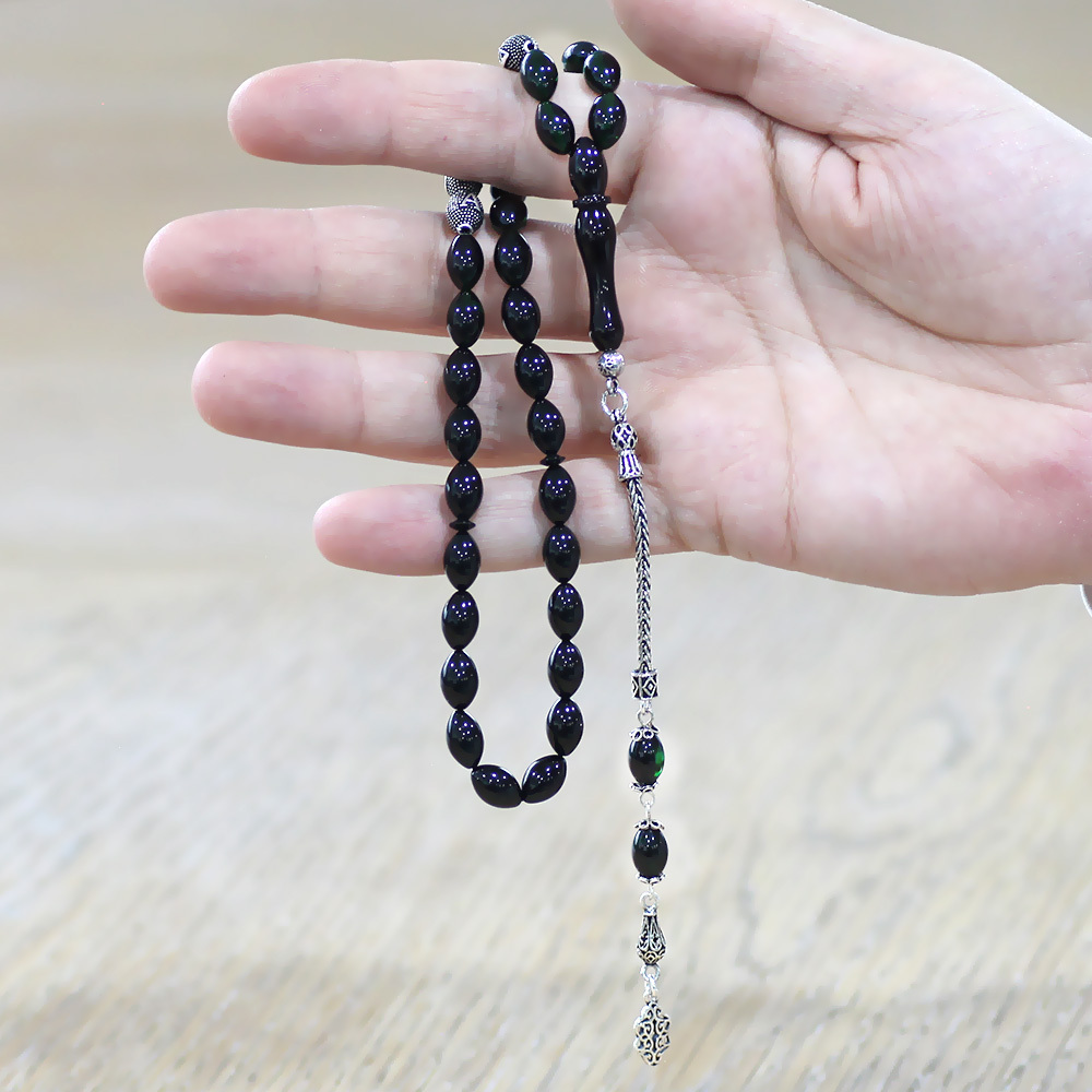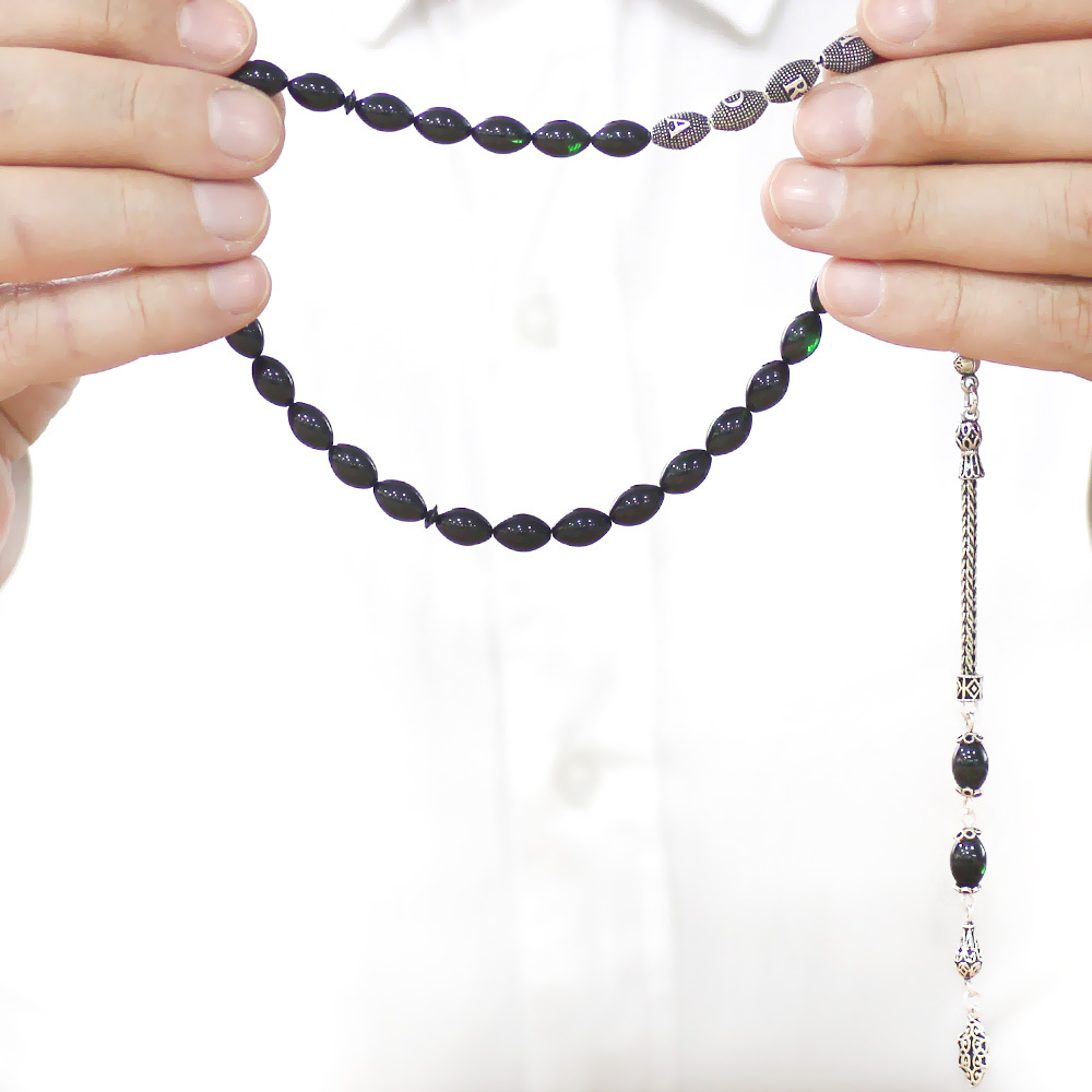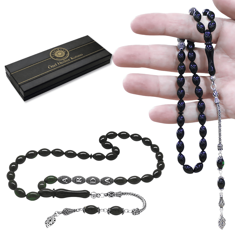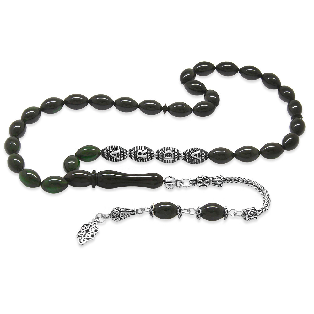 925 Ayar Gümüş Püsküllü Arpa Kesim Gümüş İsim Yazılı Süzme Yeşil Siyah Ateş Kehribar Tesbih